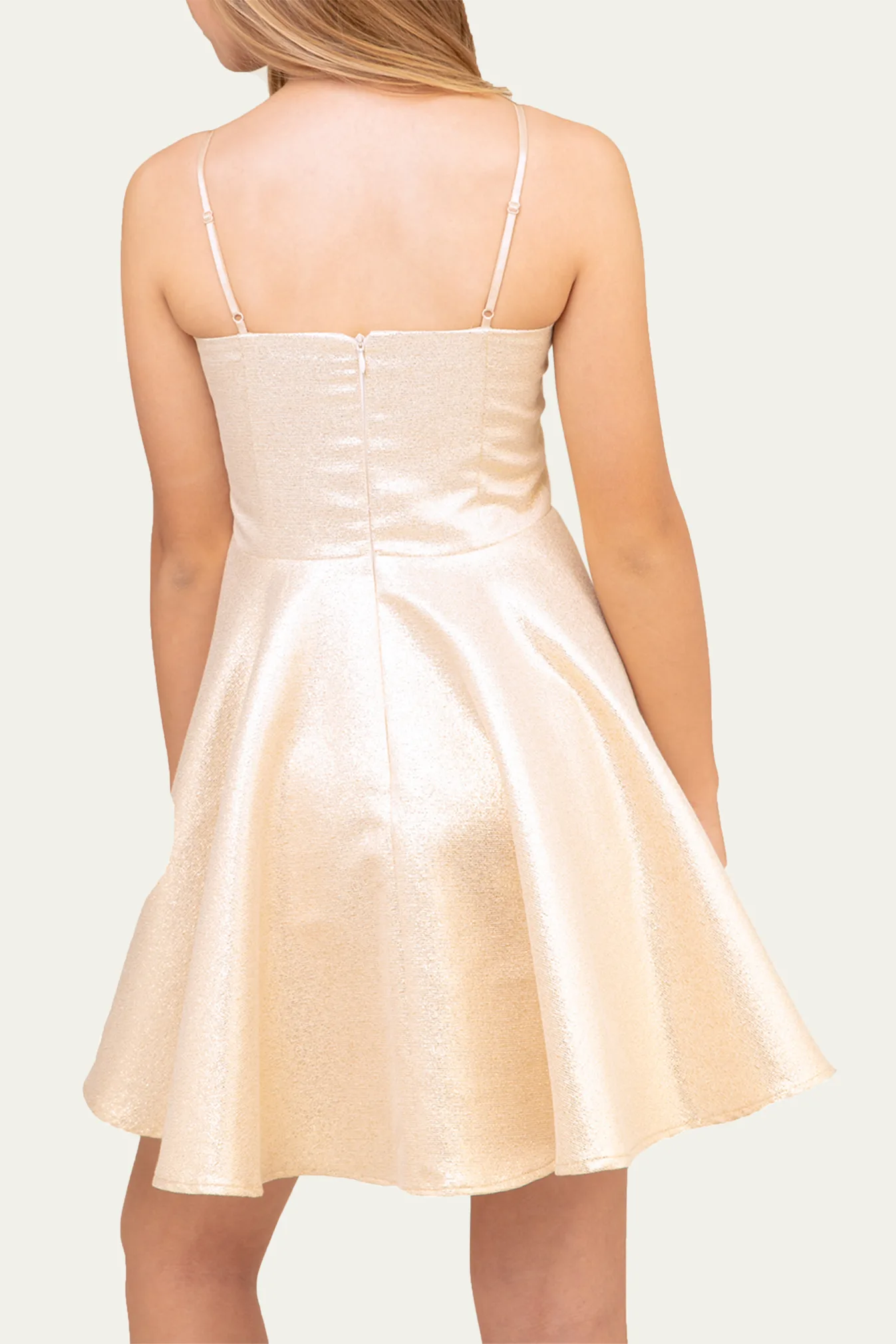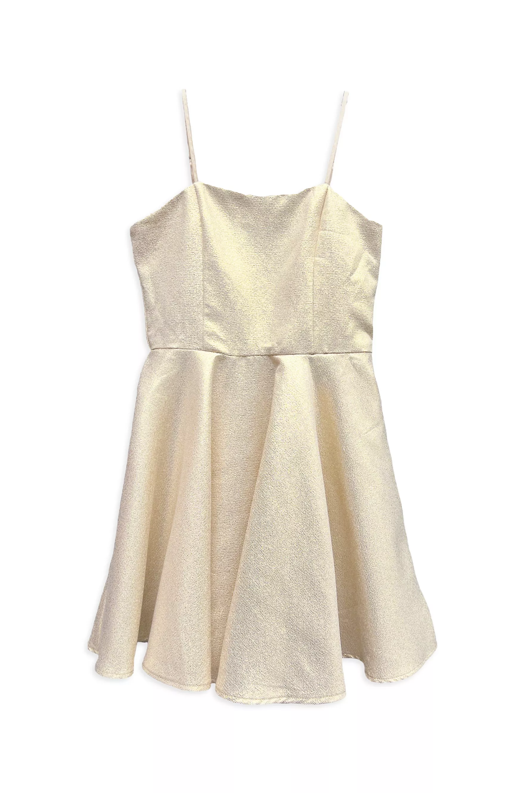 A true fit and flare dress featuring an all over, non-stretch, soft, fabric. The adjustable straps are perfect for any tween or teen girl looking to wear a fun party dress. Has an easy zipper back and high waisted detailing.