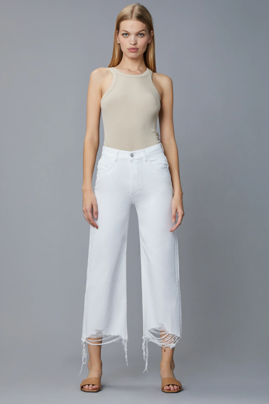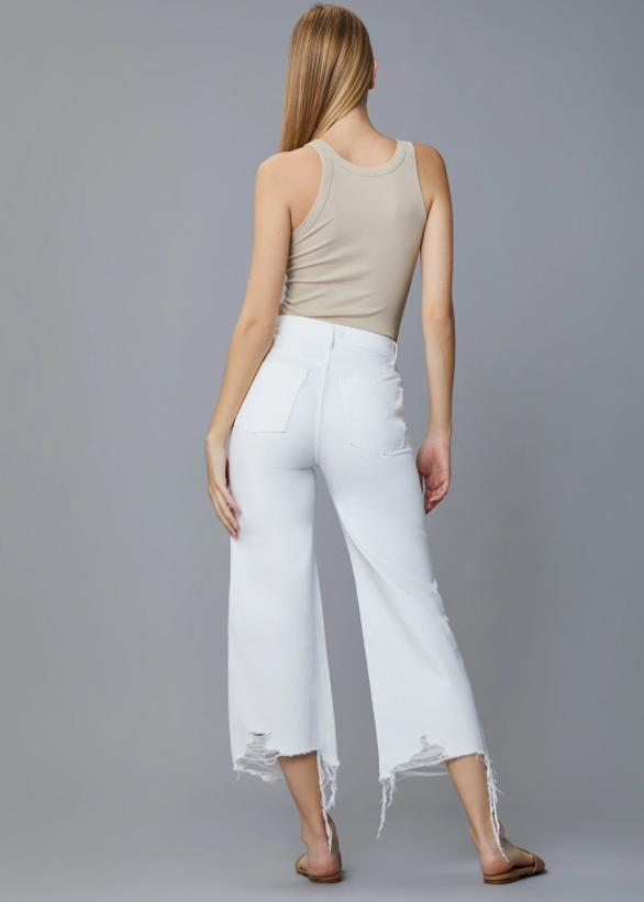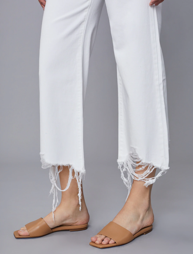 White Distressed is an opaque, fresh hue with small pocket distressing and an ultra-destructed hem. It features tonal stitching and matte silver hardware.