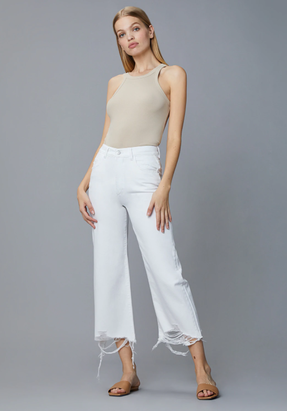 Hepburn is a vintage high-rise that is fitted through the waist and seat, tapering outward from the thigh for a wide leg that hits above the ankle.