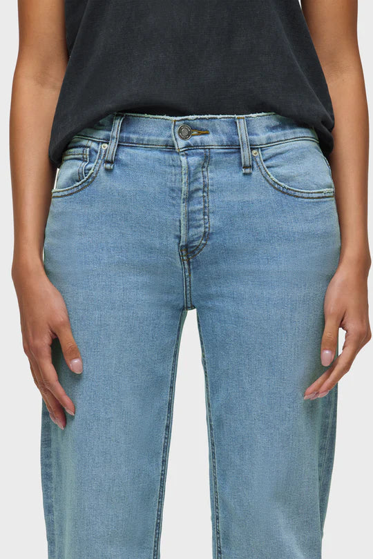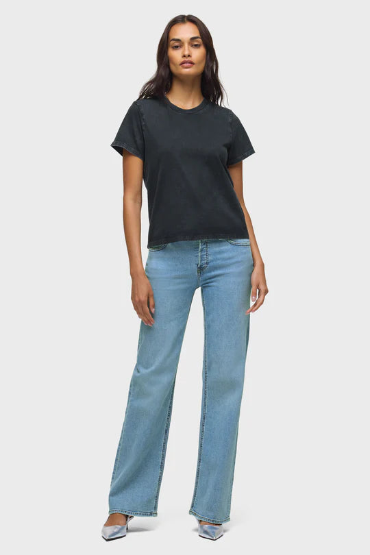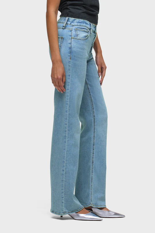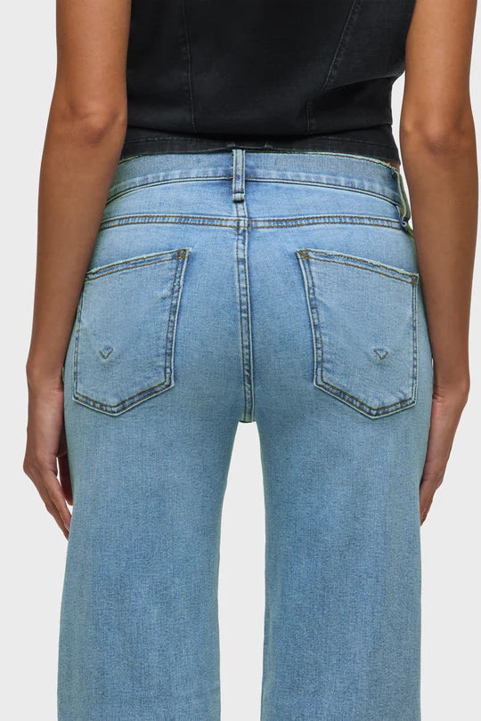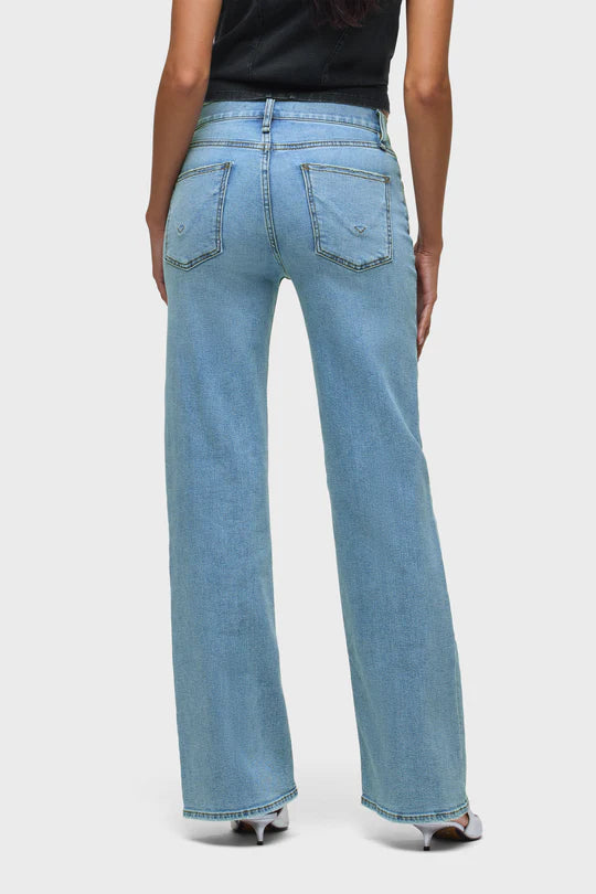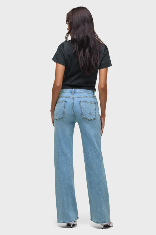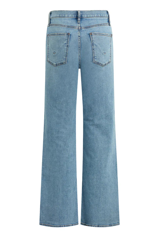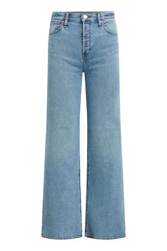 The Rosie High-Rise Wide Leg Jean in Oak has a classic fit with a 32" inseam, an elevated waistline and a roomy leg. This pair is crafted from premium comfort stretch denim in a light indigo wash and finished with a covered button fly.