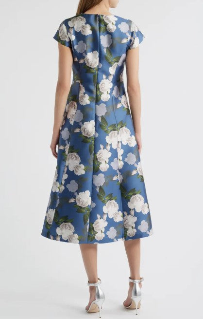 A subtle sheen elevates this figure-skimming cocktail dress romanced by blossoming flowers and finished with a perfectly flared skirt.
