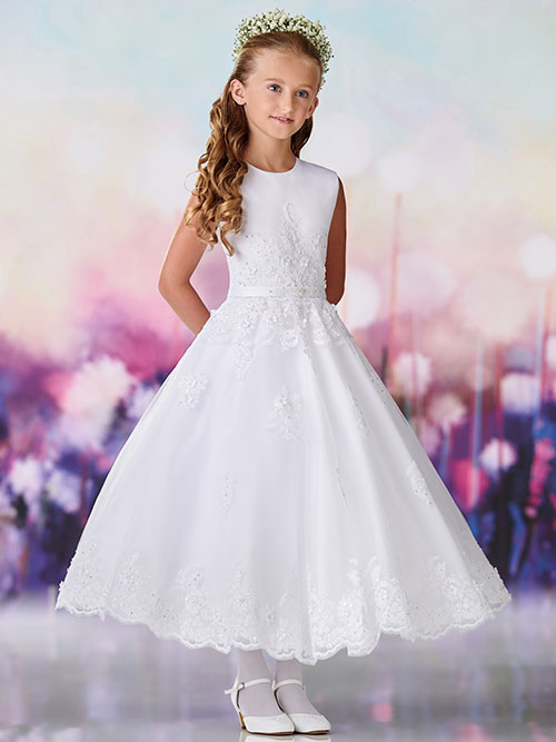 Sleeveless satin, tulle and hand-beaded lace applique tea-length A-line dress with a jewel neckline, a hand-beaded lace applique bodice with three- dimensional flower accents, a thin satin waistband with beaded motif, back covered buttons, and a tulle overlay skirt featuring matching appliques and scattered flower accents finished with a scalloped eyelash hemline.