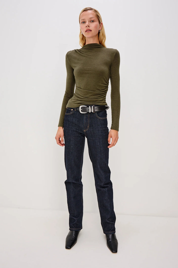 A modern take on the classic long sleeve, the Heather Olive Rails Joelle top is crafted from a soft gauge jersey with an asymmetrical mock neck with shirring details from the right shoulder.