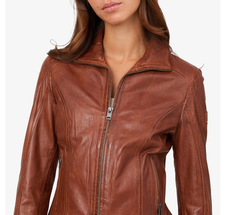 The Jolah Leather Jacket by Mauritius in a stunning brown hue captures the essence of this season's style. Crafted for both comfort and durability, it offers a timeless look that elevates any outfit.