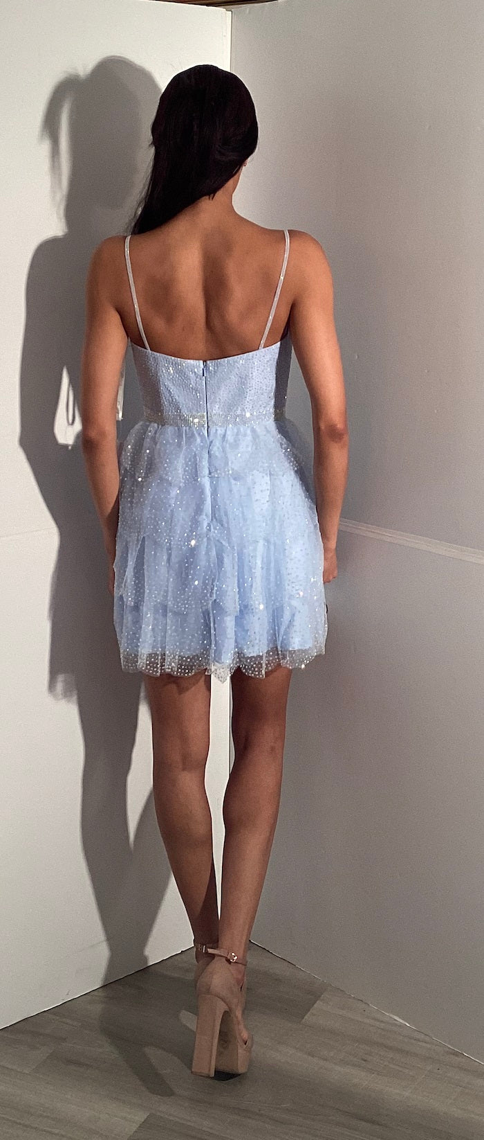 This Jovani K45723 dress dazzles with sparkling crystals scattered all over its tiered ruffles, creating a captivating, glamorous look. The delicate spaghetti straps provide comfortable support while enhancing the dress’s elegant silhouette. Perfect for making a memorable entrance, this dress combines intricate detailing with a flattering design to ensure you shine at any special occasion.