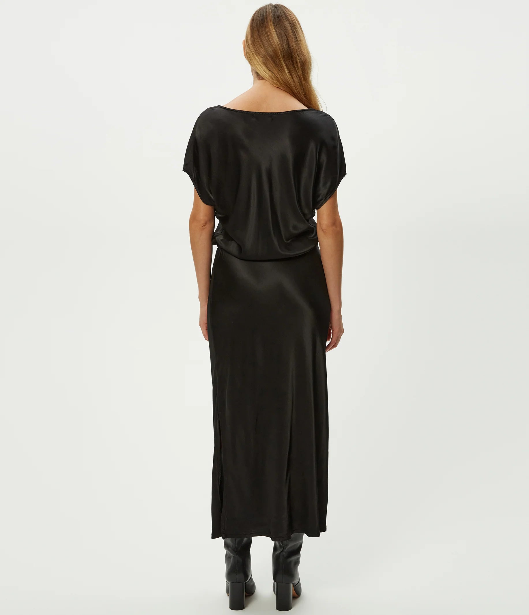 Michael Stars Karter redefines the Satin dress as a wardrobe staple. With a boat neckline and butterfly sleeves, this midi dress features an elasticized waist and a flowing skirt with a side slit. Made in L.A., washable satin, Karter delivers a relaxed fit so you can dress this up or down.