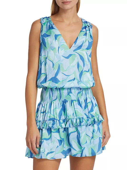 Designed with a cut out back, Ramy Brook's Kiara sleeveless minidress features a vibrant geometric print, ruffled skirt, and smocked waistband.