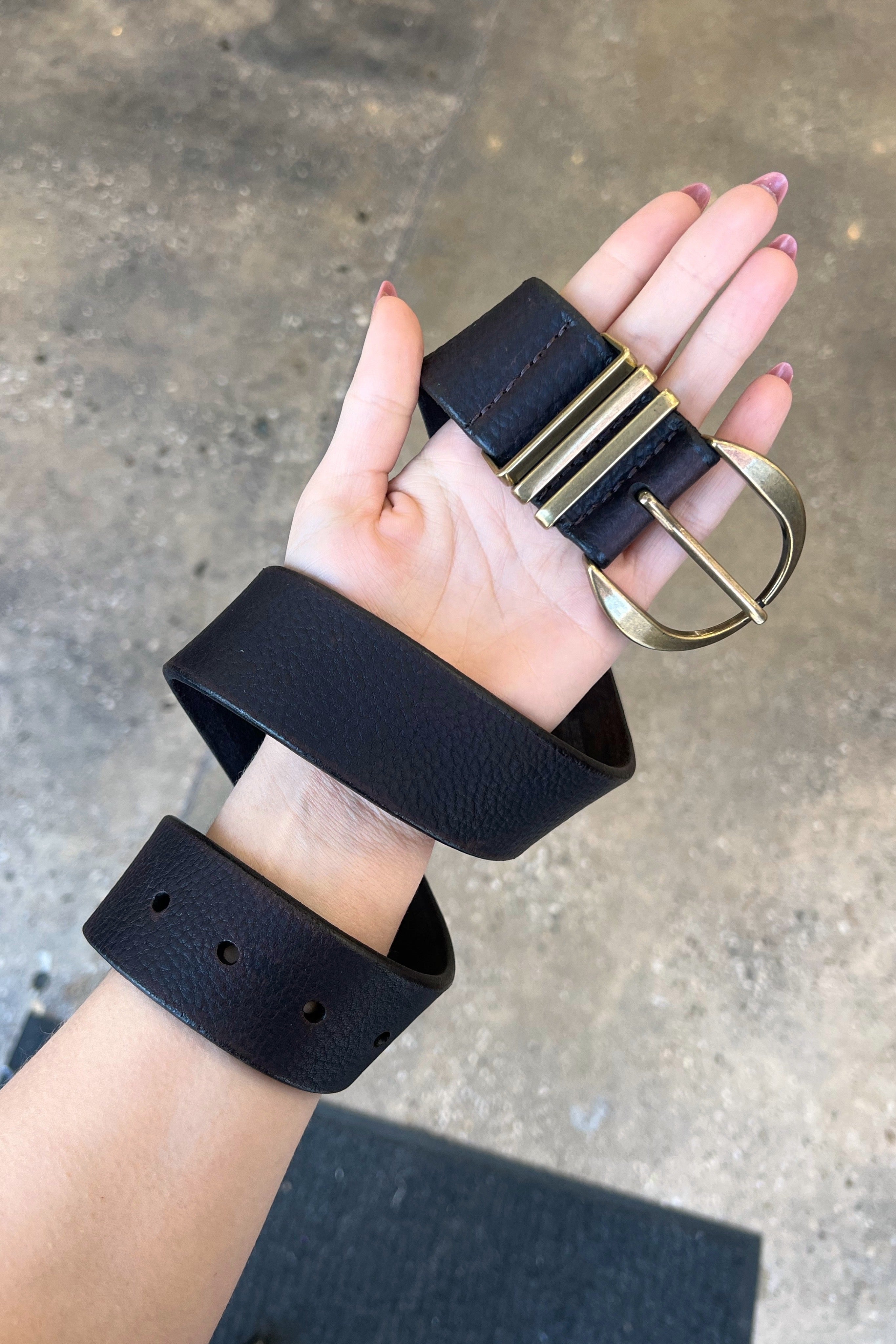 - C-shaped matte brushed buckle and triple matching keeper from Italy