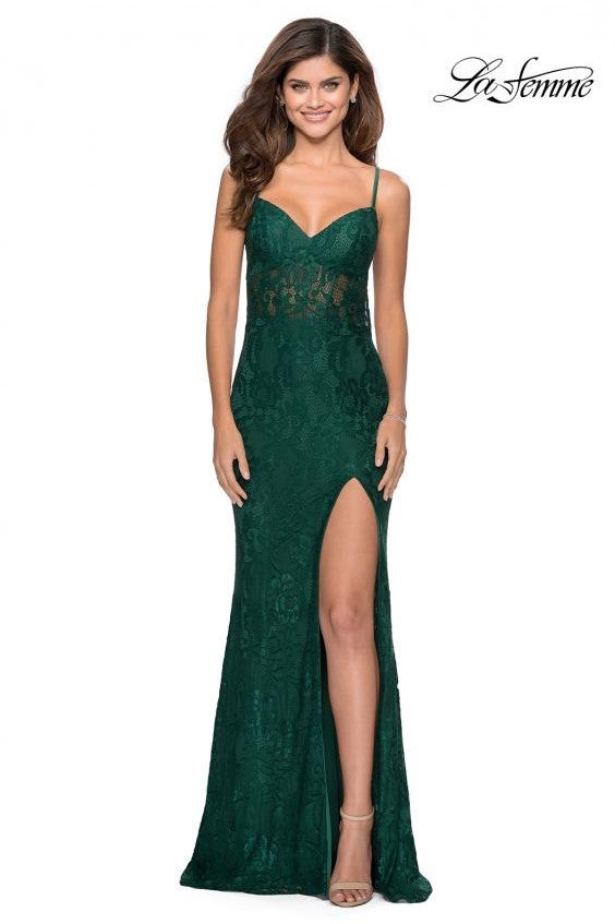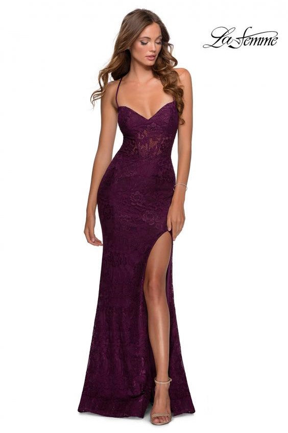 Unique and on trend long lace prom dress. Features a sheer bodice with soft V neckline and scattered rhinestone detailing. A lace up open back completes the look. Back zipper closure. Dress comes in aqua, lavender, and neon pink under number 30171. It also comes in orange and red under number 30671.