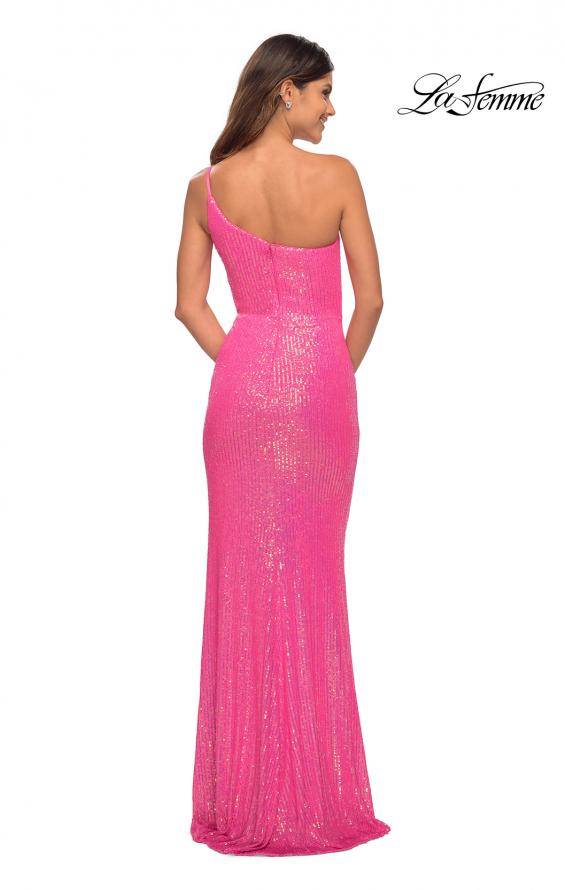 Simple one shoulder stretch sequin gown with slit in hot pink. Back zipper closure. Dress comes in aqua, light periwinkle, orange, purple, and yellow under number 30618. It also comes in black, red, royal blue, and white under number 30391.