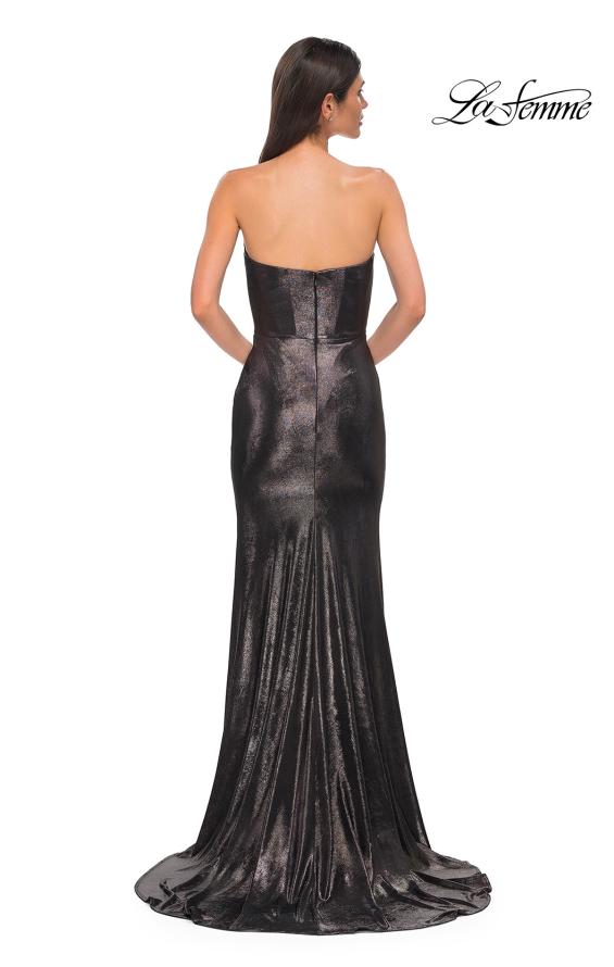Fabulous and versatile strapless brushed metallic dress with a draped neckline and slit. Back zipper closure.