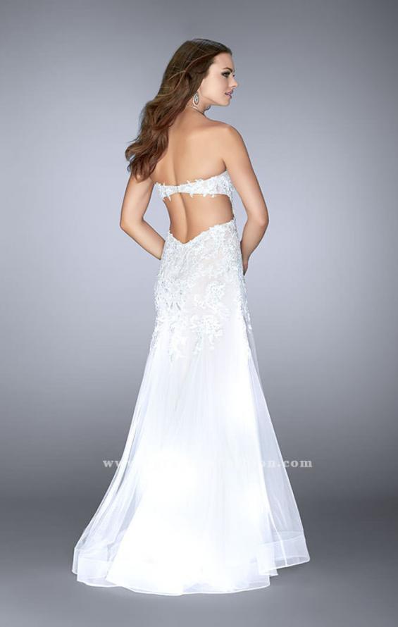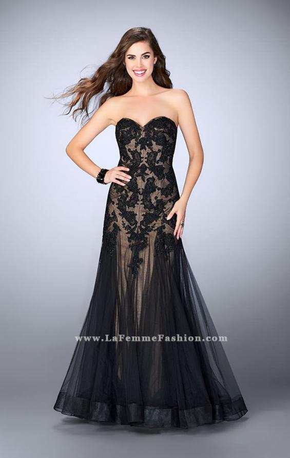 Stunning strapless mermaid dress with lace appliques and tulle skirt. Features an open back. Back zipper closure.