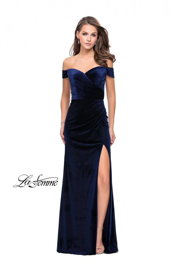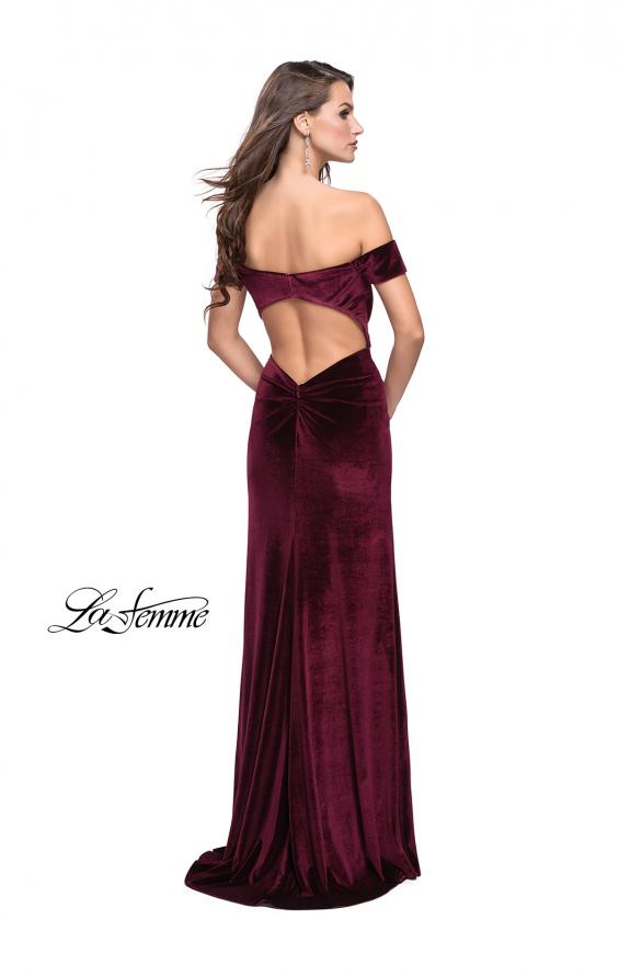 Classic off the shoulder velvet dress with gathering on the front. This dress has an open back and gathering on the back of the skirt. Back zipper closure.