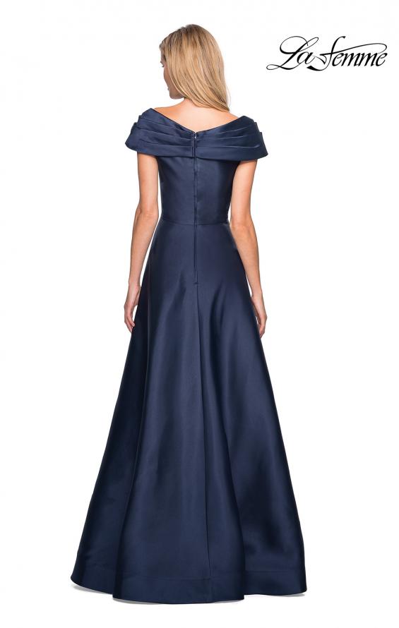 La Femme style 26877 mother of the bride gown. A-line mikado off the shoulder gown with pockets. Back zipper closure.