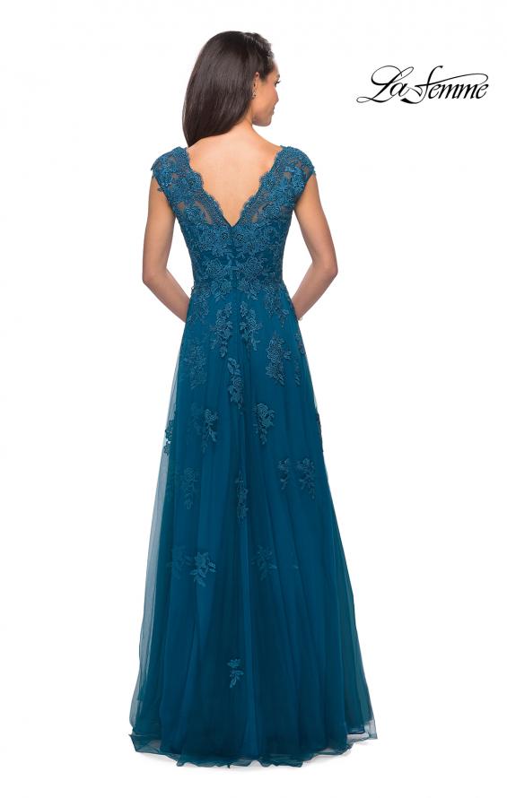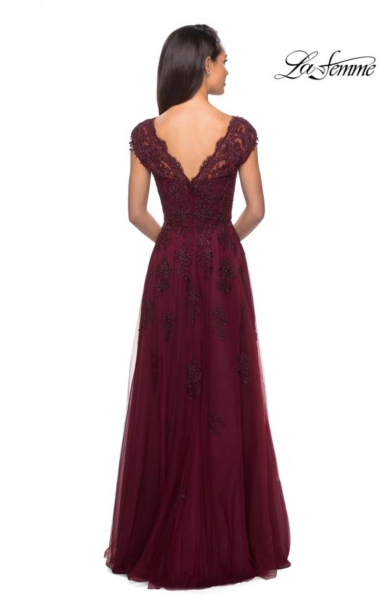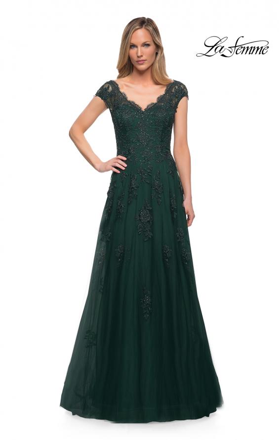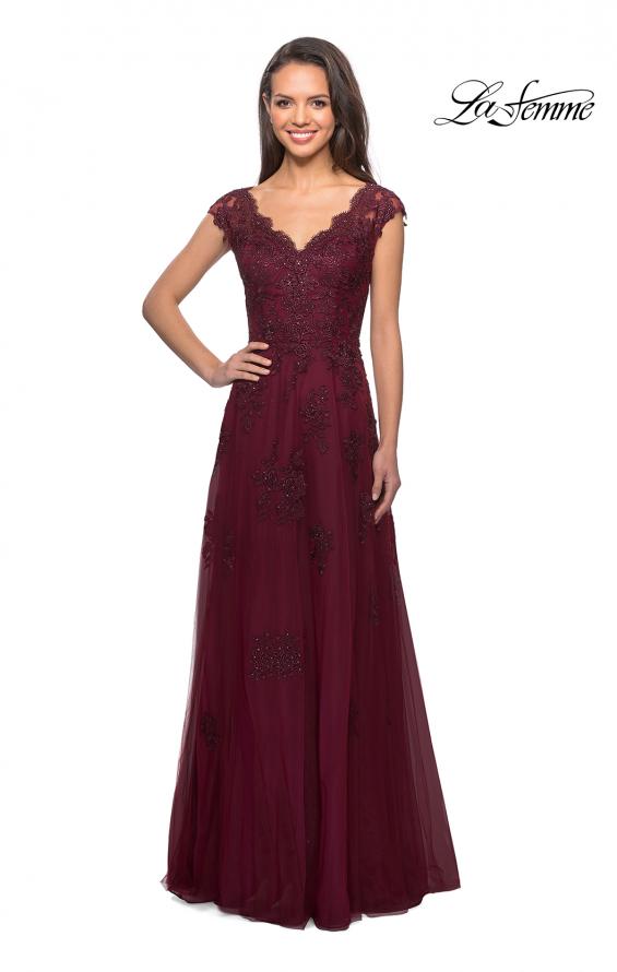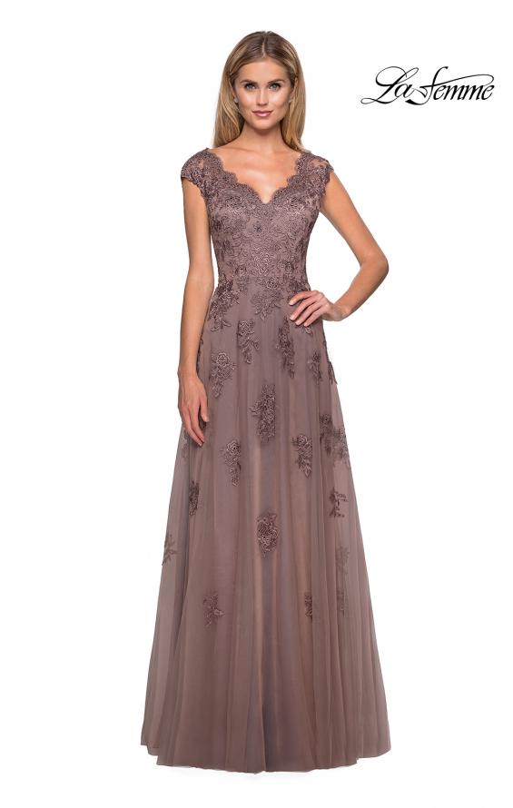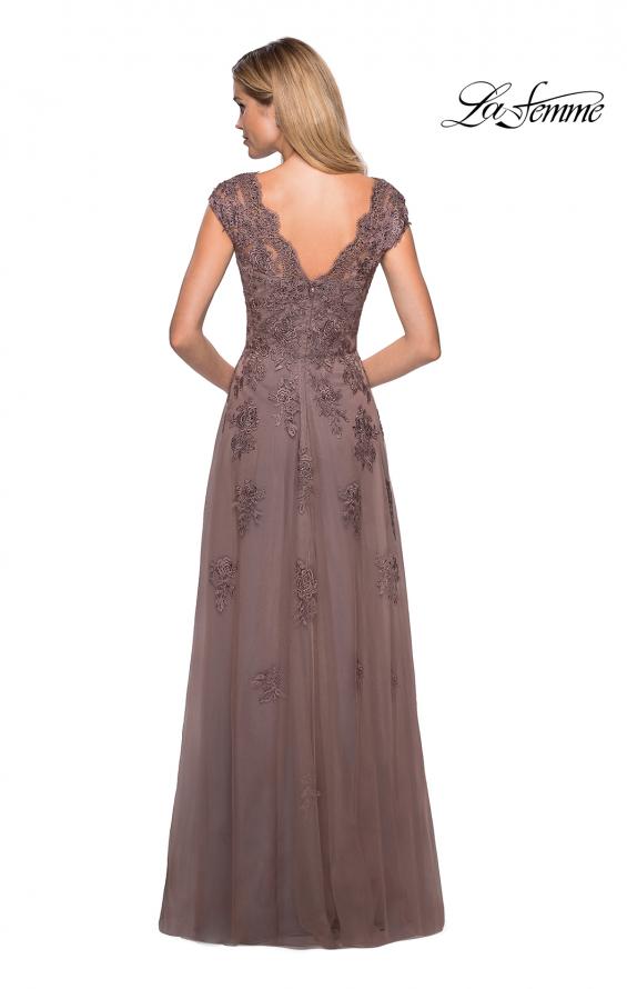 Short sleeve lace gown for the mother of the bride or groom. Features a scalloped V shaped neckline. Back zipper closure.