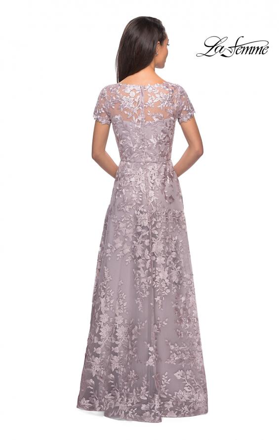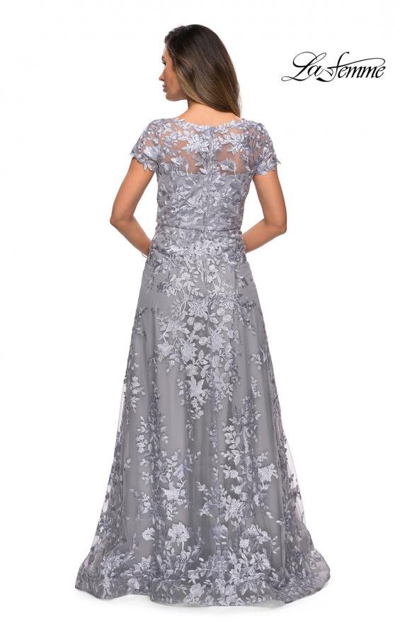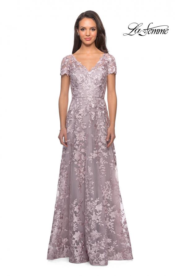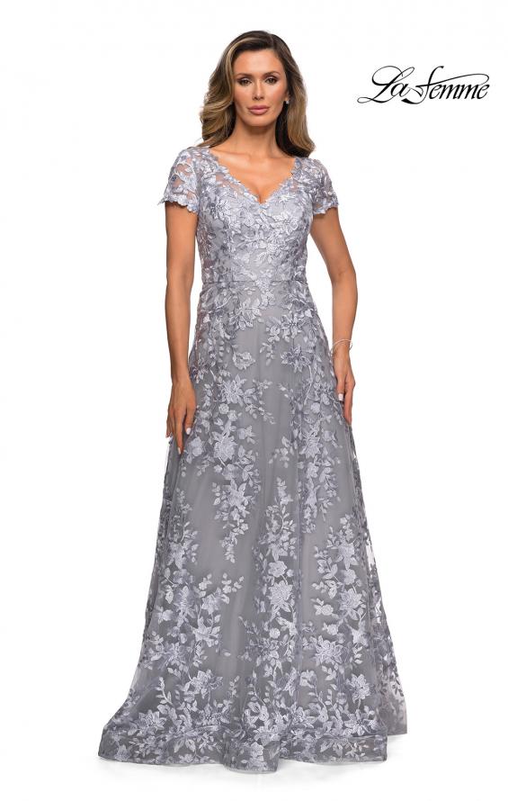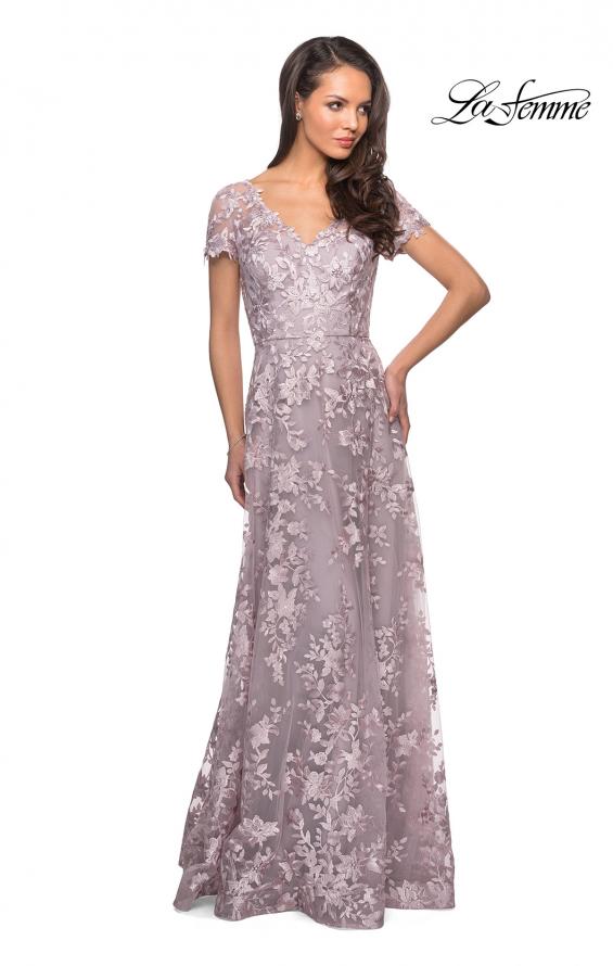 Elegant floor length evening gown with delicate lace overlay. Features a defined waist. V shaped neckline, and flattering sheer cap sleeves. Back zipper closure.
