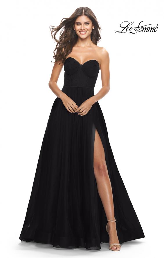 Elegant tulle A-line gown with high slit. Bodice features sheer boning detail and defined cups. Back zipper closure.