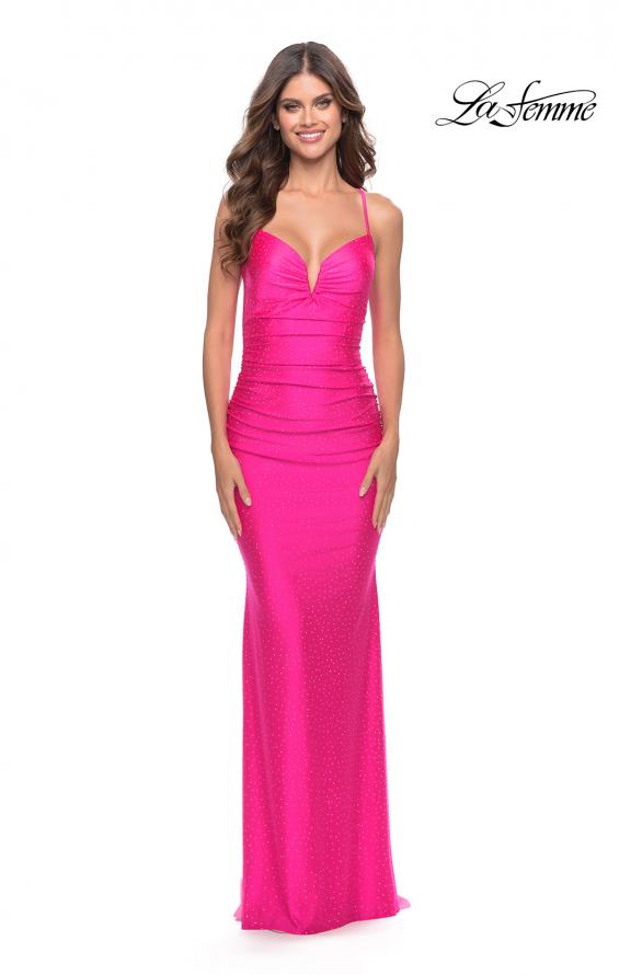 Rhinestone jersey prom dress with ruching and deep V neckline. Lace up open back. Back zipper closure. Dress comes in mauve, pale yellow, red, royal blue and royal purple under number 31201.