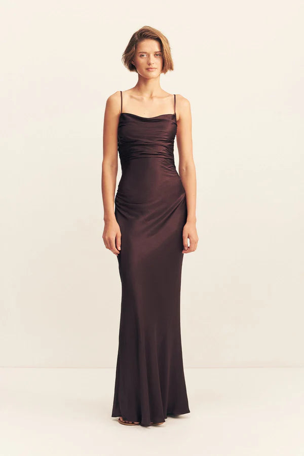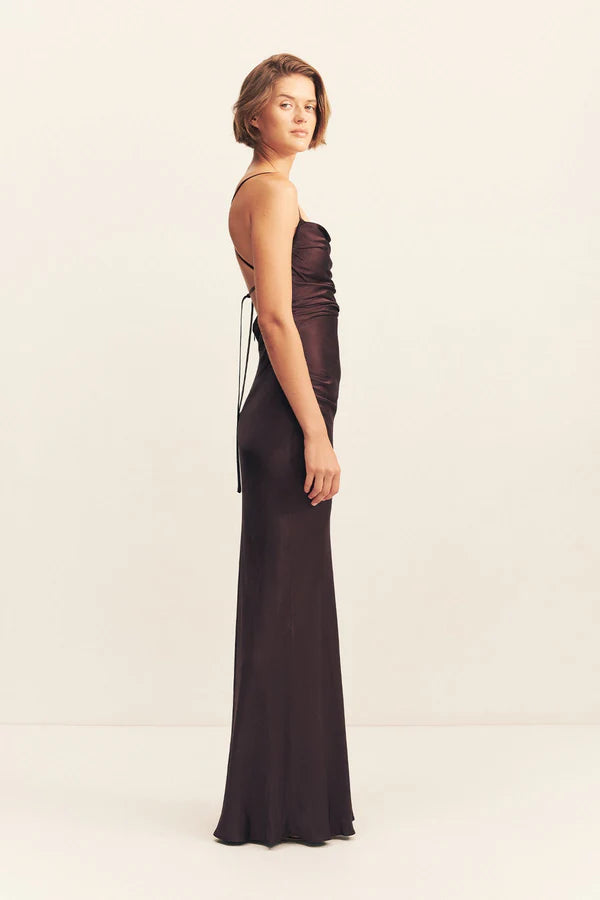 Lace back maxi dress in espresso by Shona Joy. The perfect fall guest of wedding, formal occasion slip dress look in a LENZING™ ECOVERO™ with luxurious satin finish.