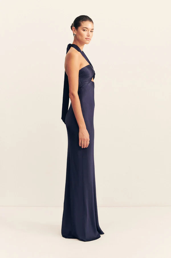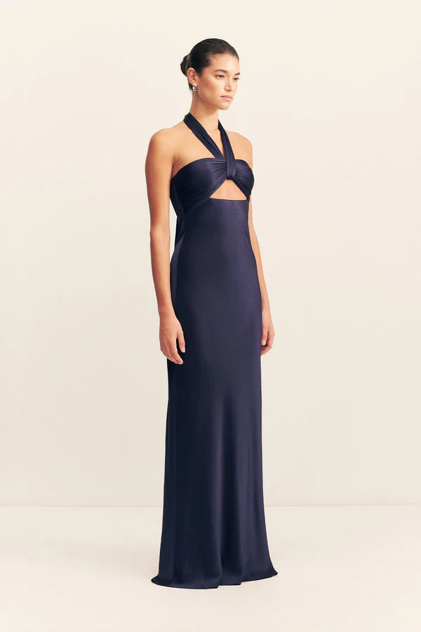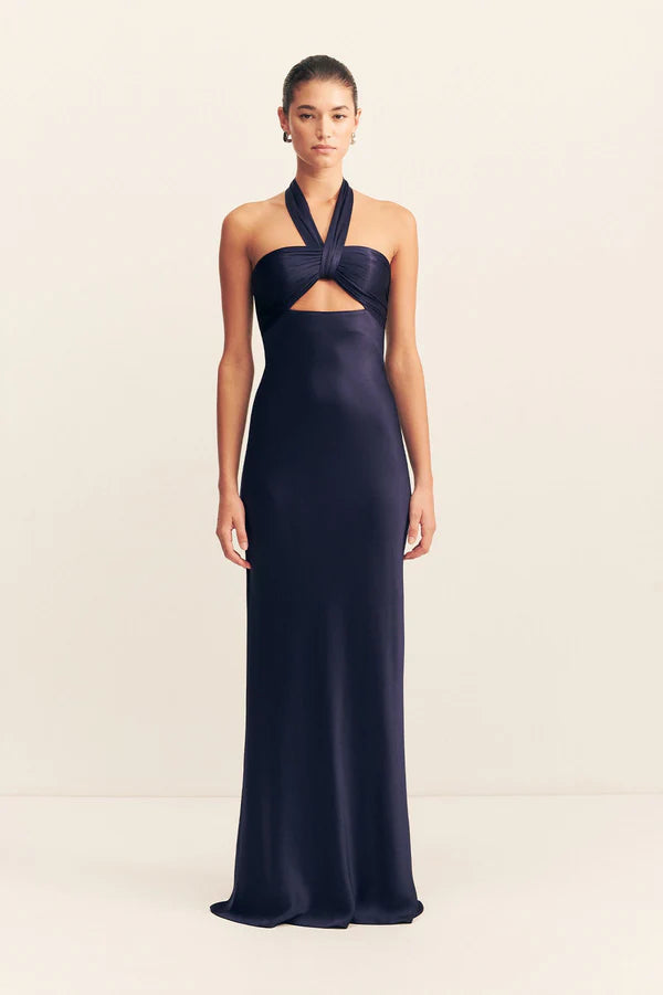 Halter maxi dress with cut out detail in a silk touch fabric with a luxurious sheen.