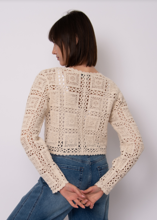 The Laurel Cardigan in parchment is a timeless layering essential. This long sleeve crew neck design features a relaxed fit perfect for everyday wear. Hand-crafted with quality crochet construction, it drapes beautifully and pairs effortlessly with your favorite pieces. The soft parchment tone works with any wardrobe, making it a versatile staple you'll reach for season after season.