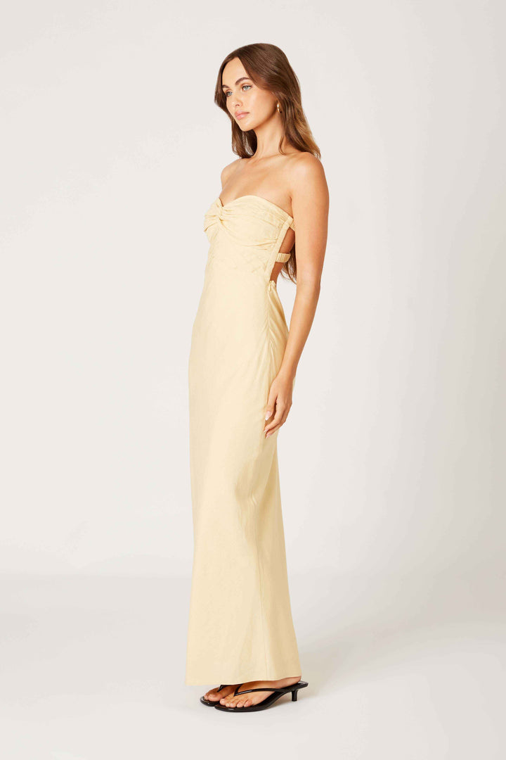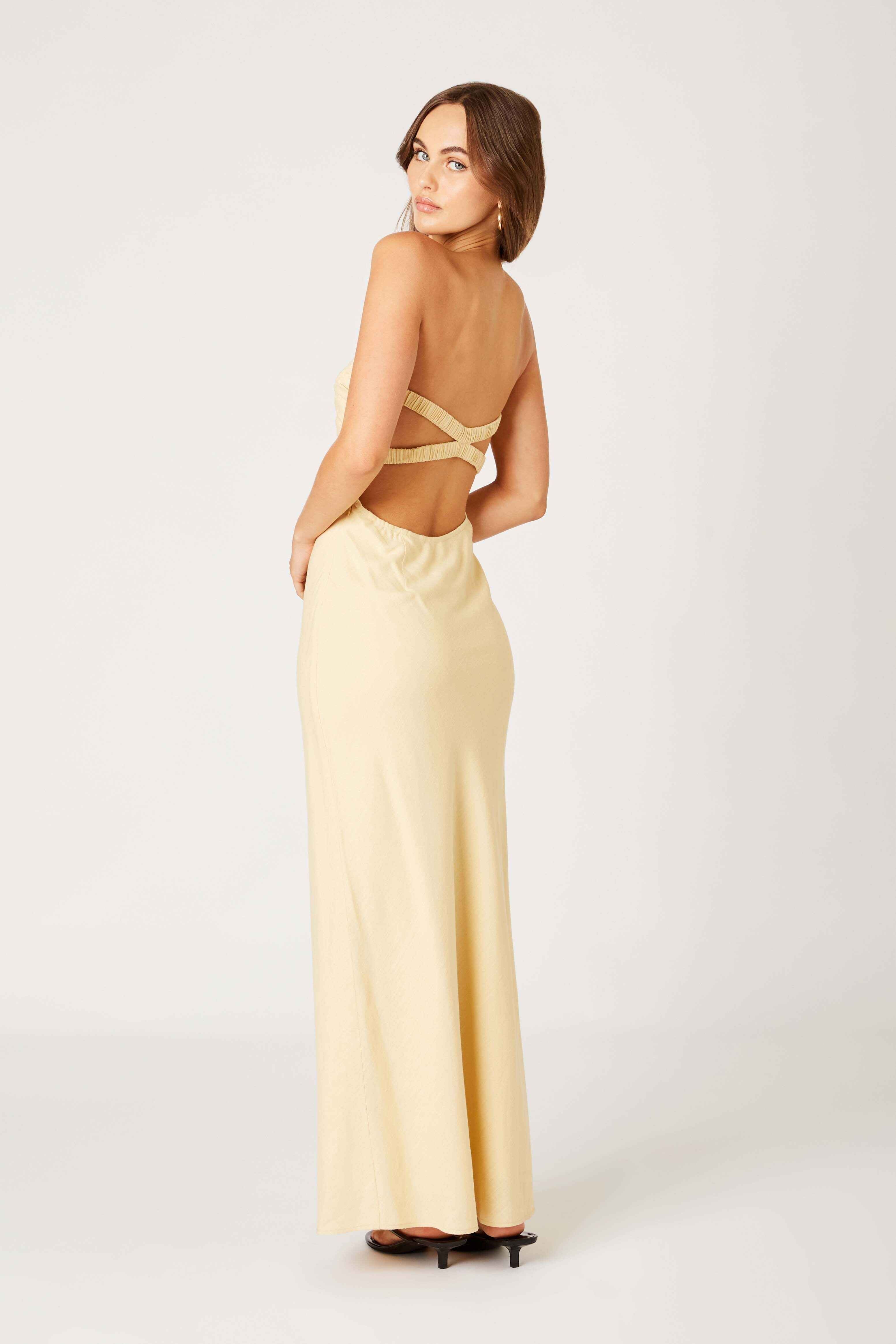 Butter yellow strapless maxi dress with twist ruched bodice and double elastic crisscross back straps.