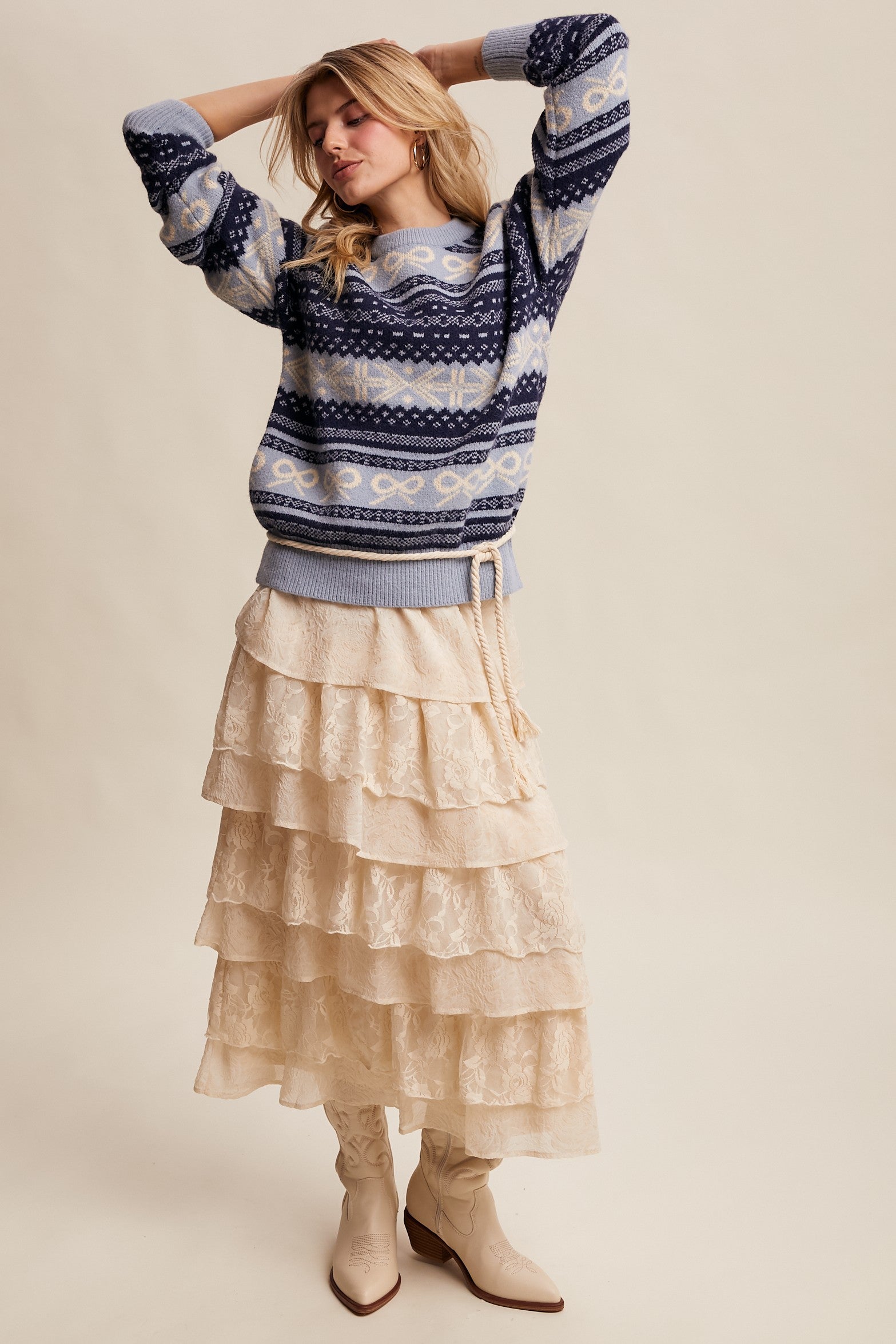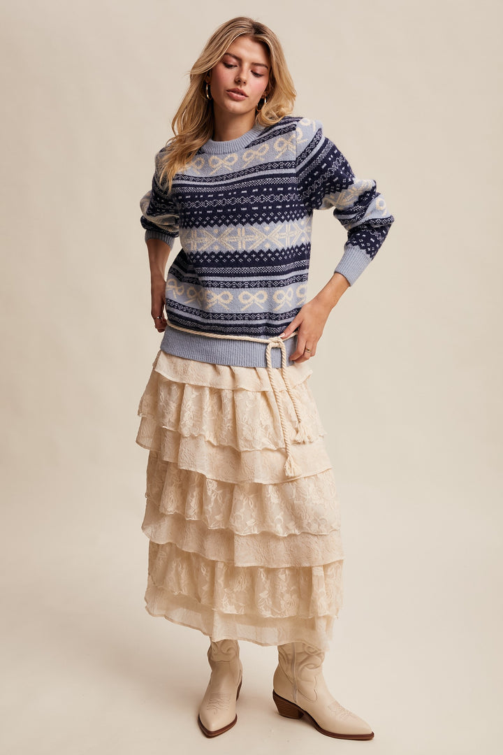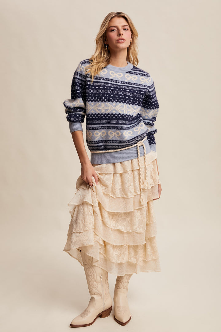 With a sweet bow-inspired graphic motif and retro patterning, this pullover brings winter boho vibes to your knitwear drawer. Perfect with pleated skirts or cargo jeans for an unexpected twist, it's a cheerful layering piece for Game Day outings and cozy weekends alike.