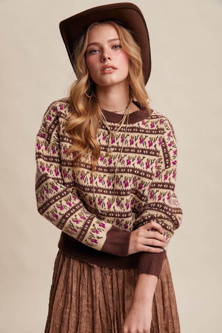 With its desert-patterned knit and cozy weight, this sweater effortlessly blends Western nostalgia with modern layering-perfect for styling with jeans, cargo pants, or even tucked into a midi skirt for a polished boho look.