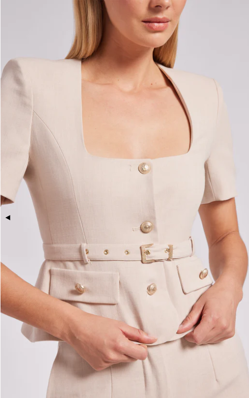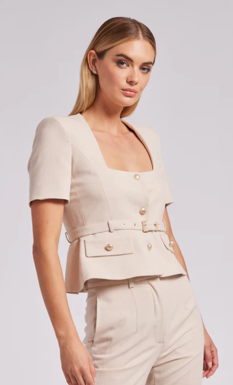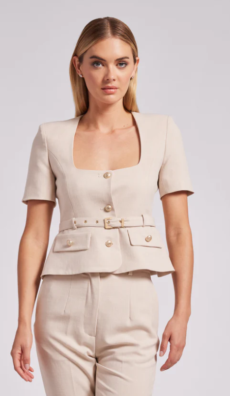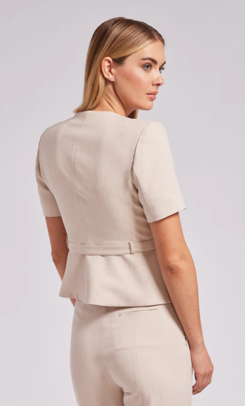 Bring some retro vibes with the Lois. Made of a soft rayon blend with strong shoulders and sleek gold buttons, this short sleeve, belted blazer will pair perfectly with tailored slacks and patent leather heels for an 80's-inspired work look. For a more casual look, wear it with your favorite denim and sneakers.