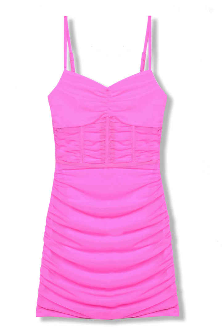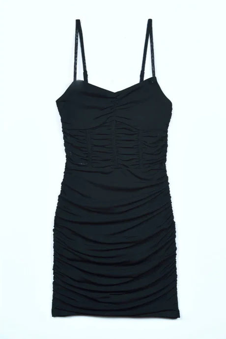 Matte mesh fabric with ruching detail throughout.