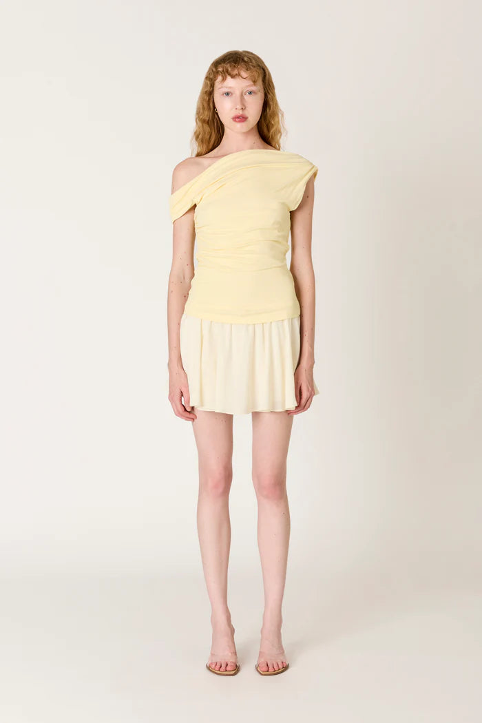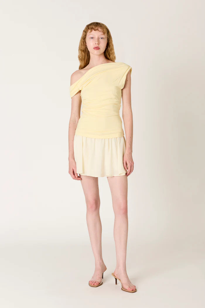 The Mariposa Top is defined by a fitted, body-skimming silhouette that contours the frame. It features a striking asymmetric one-shoulder neckline and horizontal ruching across the front for added texture and dimension. Designed in a pull-on style with stretch, this piece offers a sleek, streamlined fit while maintaining a soft, comfortable feel.