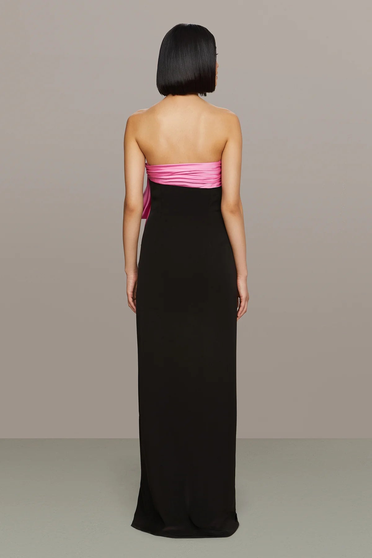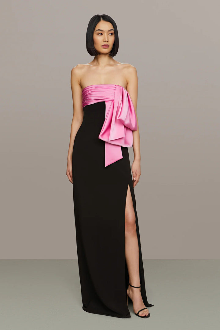 Sleek sophistication meets drama in this pink and black colorblock gown. A hidden corset hugs your curves, while the column shape and draped fabric give it an effortlessly luxurious feel. The oversized bow adds just the right touch of excitement.
