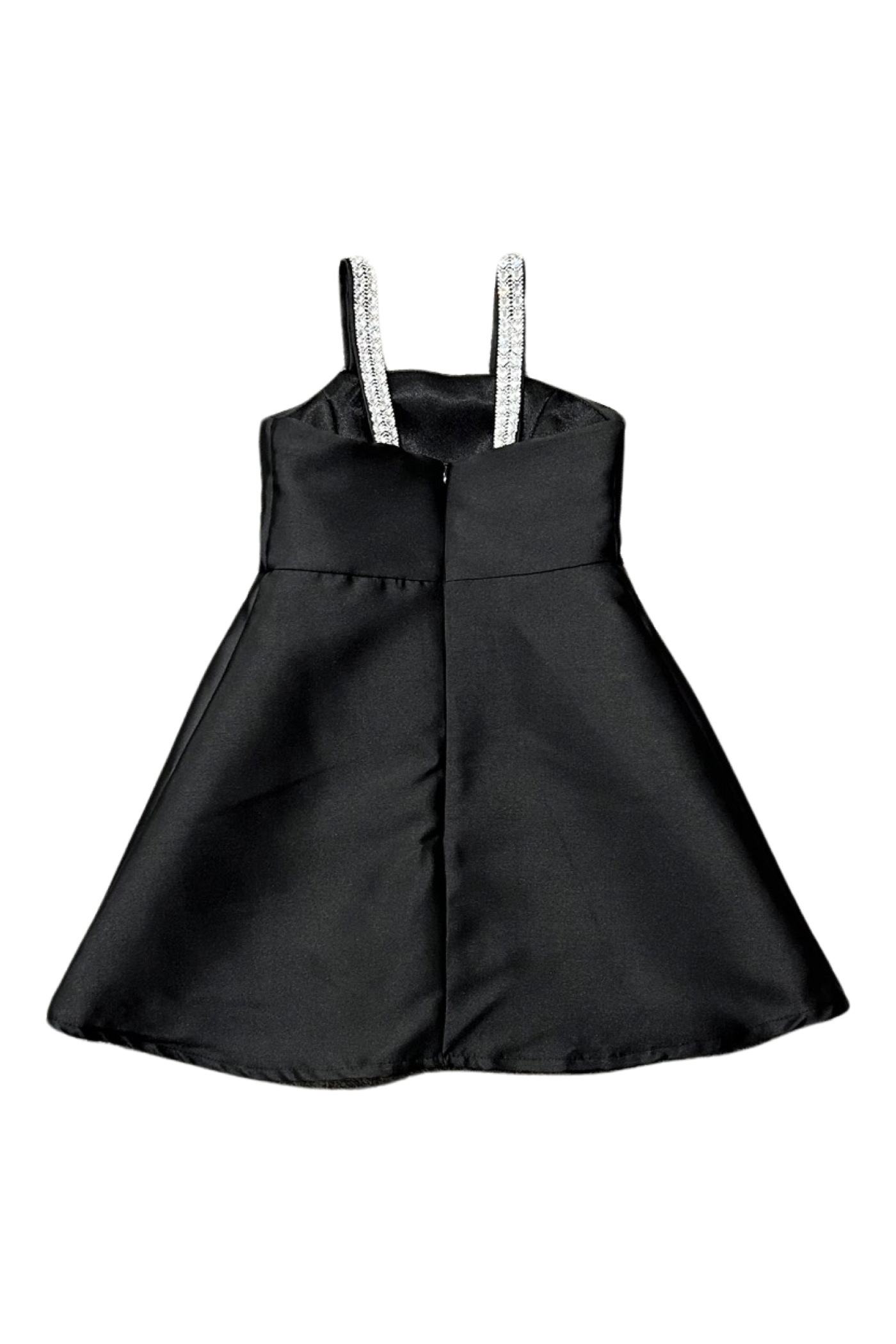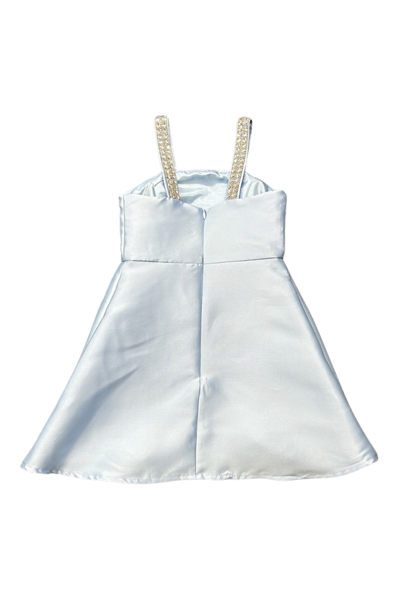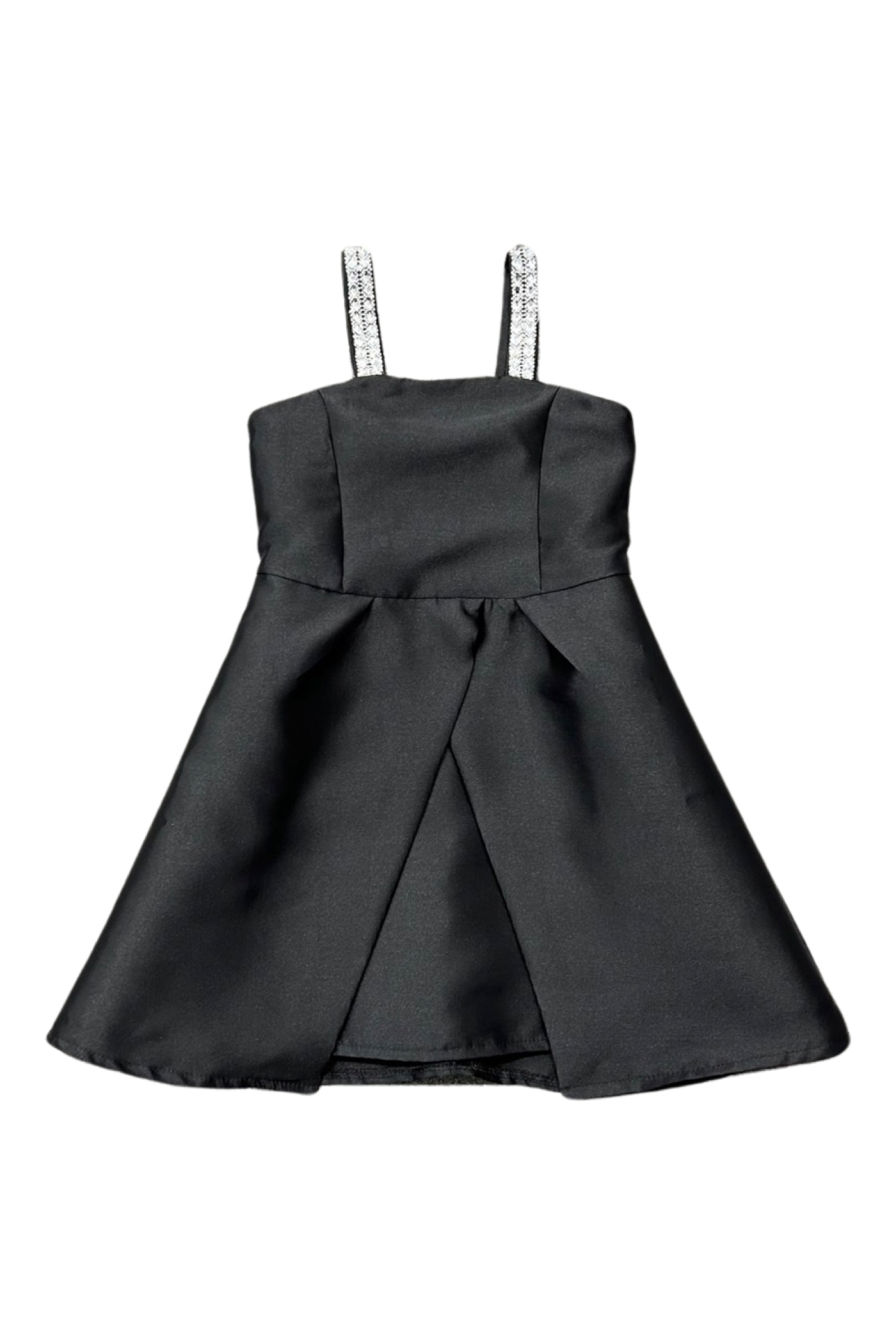 Dolls and Divas girls tulip hem style mikado party dress with rhinestone straps.