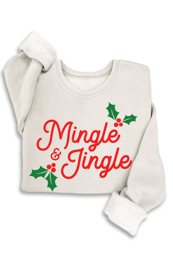 Supersoft pullover sweatshirt in white with "Mingle Jingle" graphic.