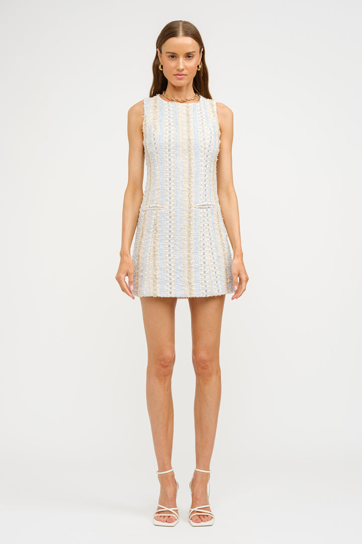 Baby blue and shimmer mixed tweed sleeveless shift mini dress.