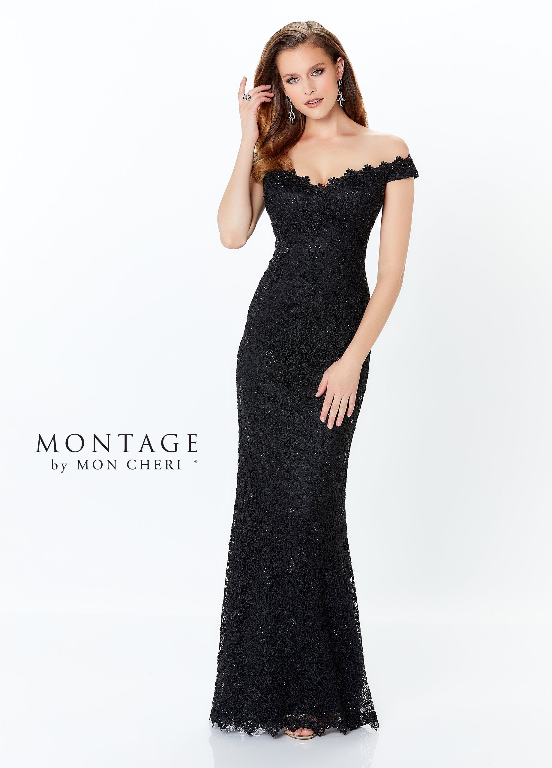 Off-the-shoulder lace fit and flare gown with light scattered hand-beading, scalloped front and back wide V-necklines, scalloped hemline, slight sweep train. Matching shawl included.