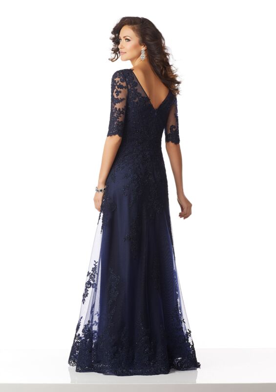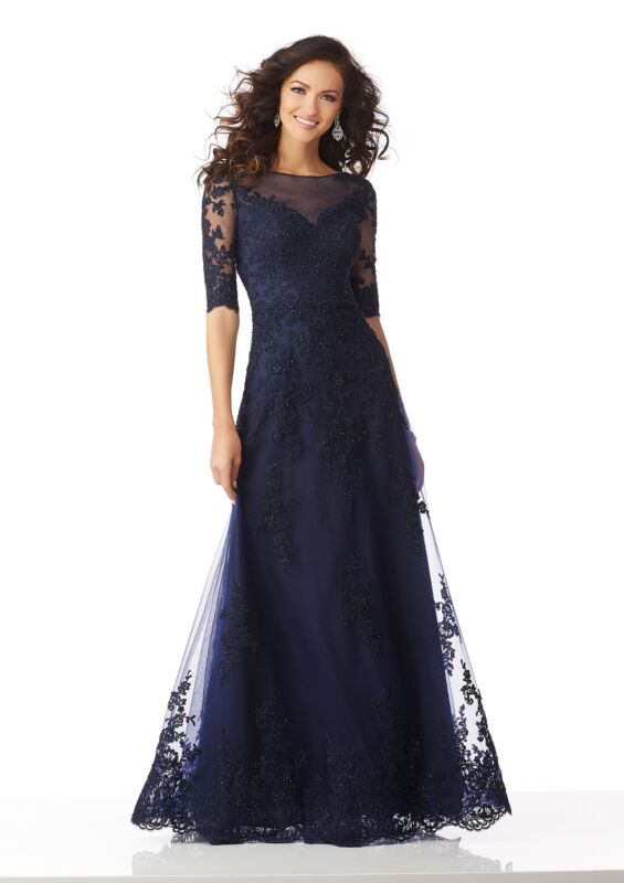This MGNY by Mori Lee 71818 navy blue mother of the bride dress features illusion half sleeves extending from the sheer bateau neckline and mid V-back. Beaded lace appliques on net overlay this A-line gown, finished with a scalloped hem.
