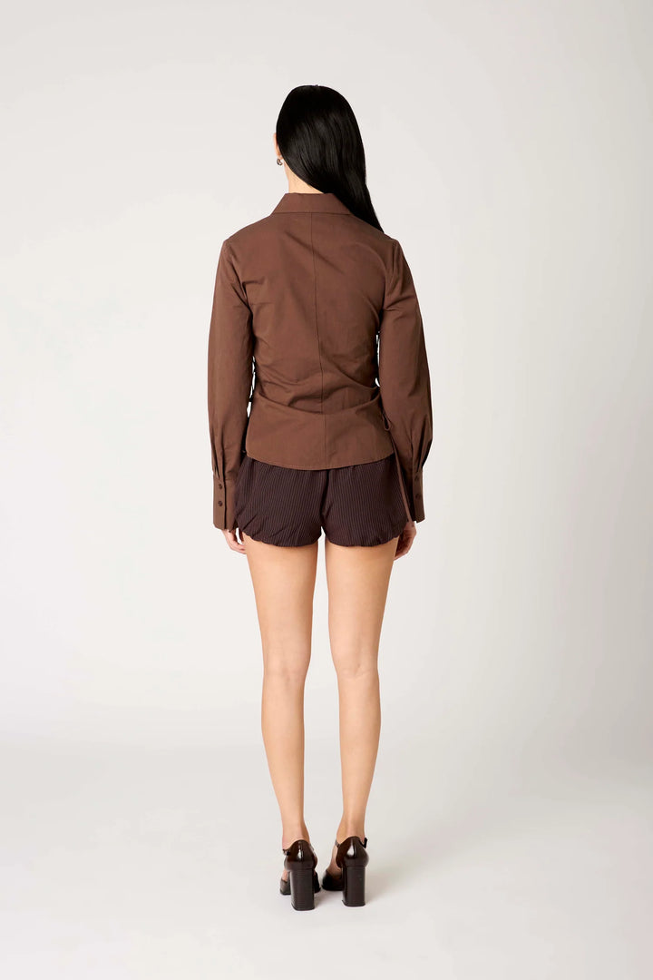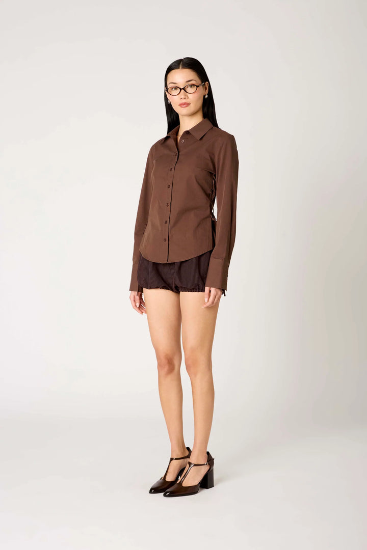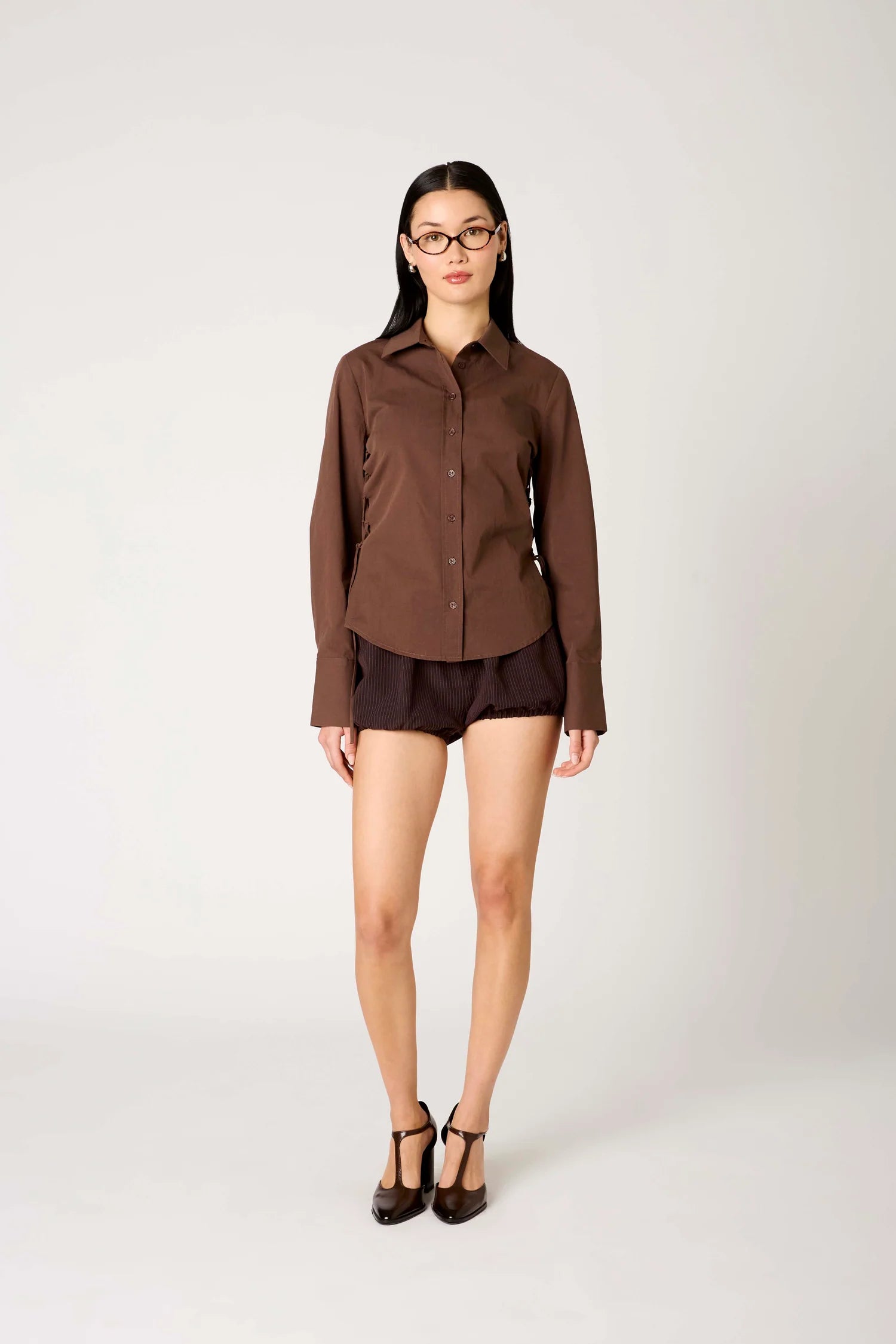 Crisp and classic - the Alara Shirt is a long sleeve button-down crafted from structured cotton poplin, designed with a collared neckline, darted sides, accent side ties and a clean curved hem. Buttoned cuffs and precise seaming give it a sharp finish—an easy staple that works layered or on its own.