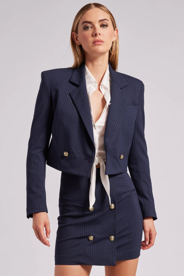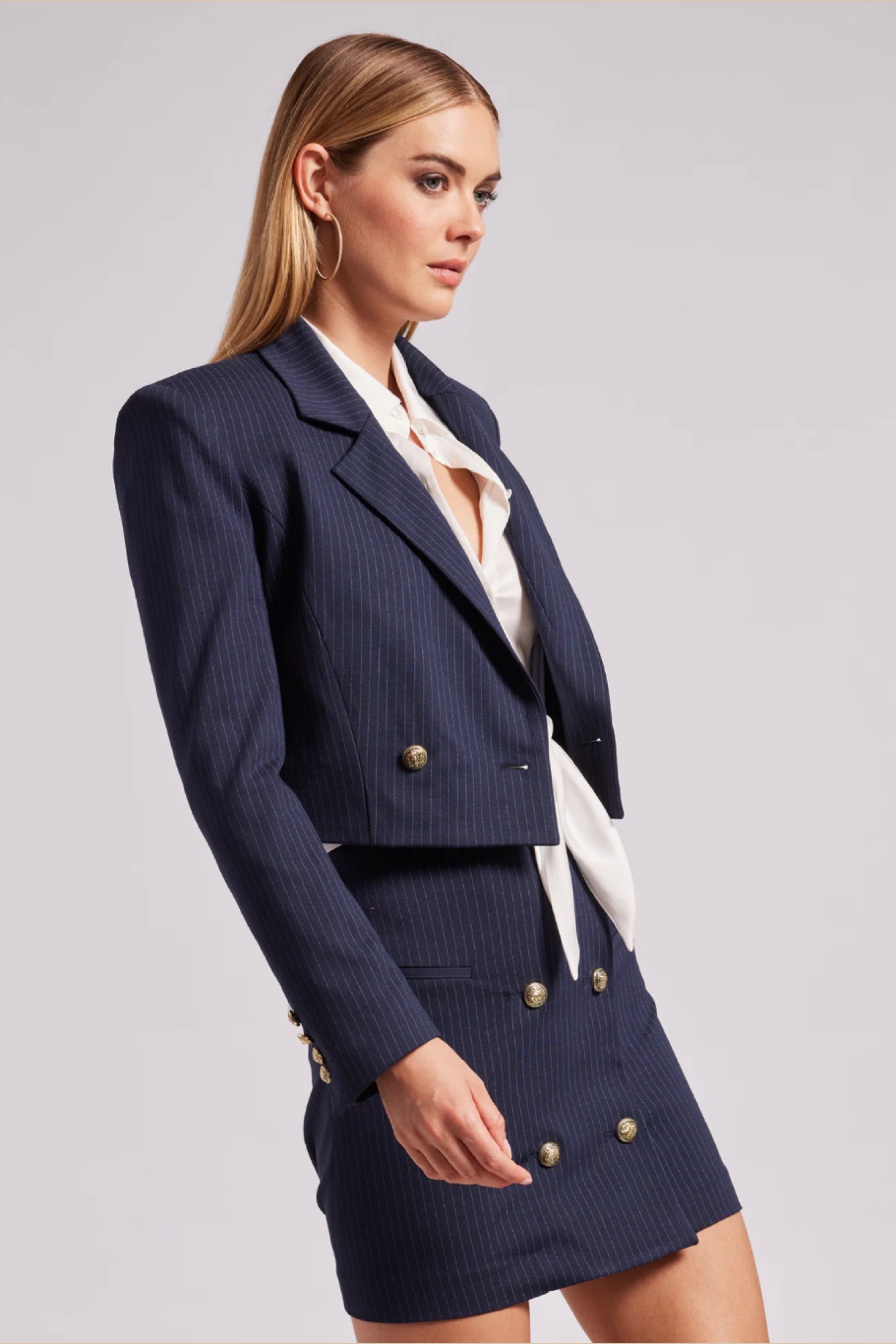 The Nicolette is one perfectly preppy blazer. Made in a modern cropped silhouette with glam gold buttons and a chic pinstripe design, this jacket is perfect for bringing a pop of print to the office. Complete your work-ready look with sleek slacks and a button-up.