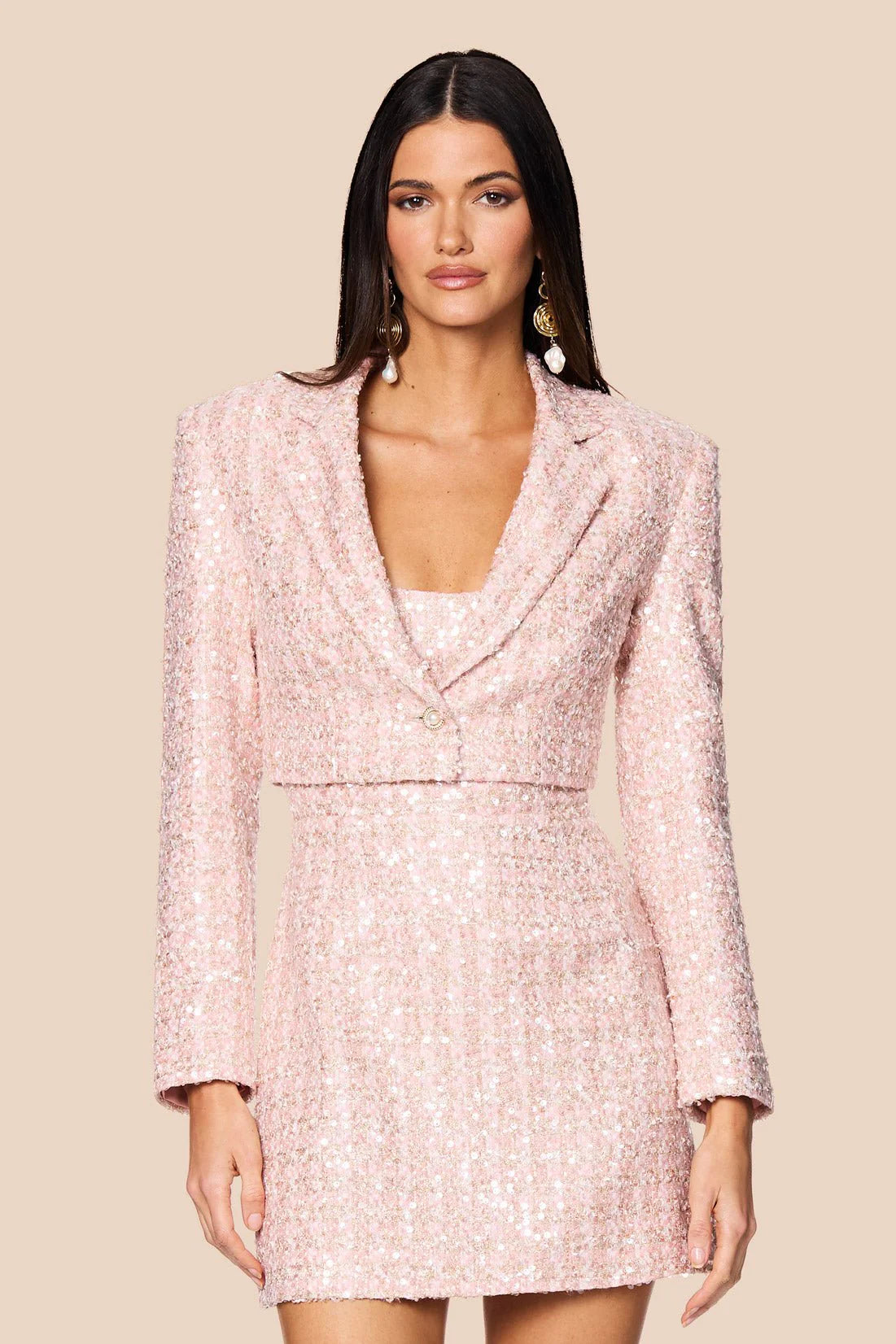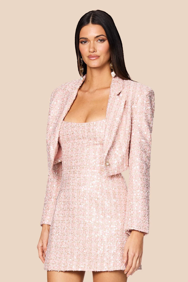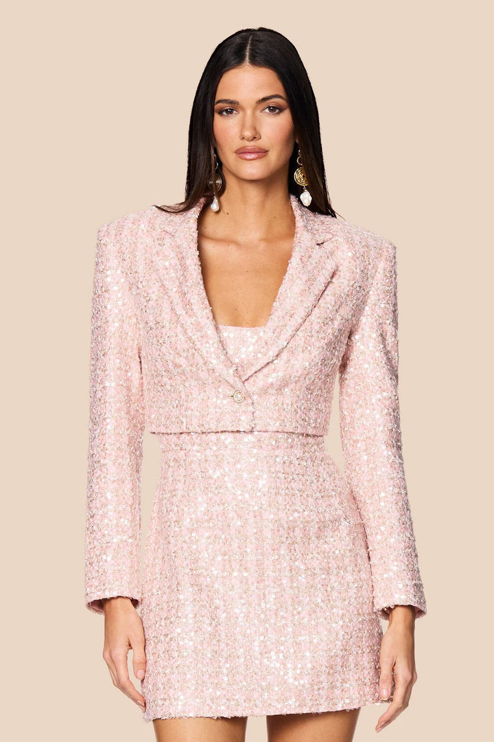 Luxe cropped jacket with single button closure. Crafted in a tweed suiting with mini sequin, fully lined.