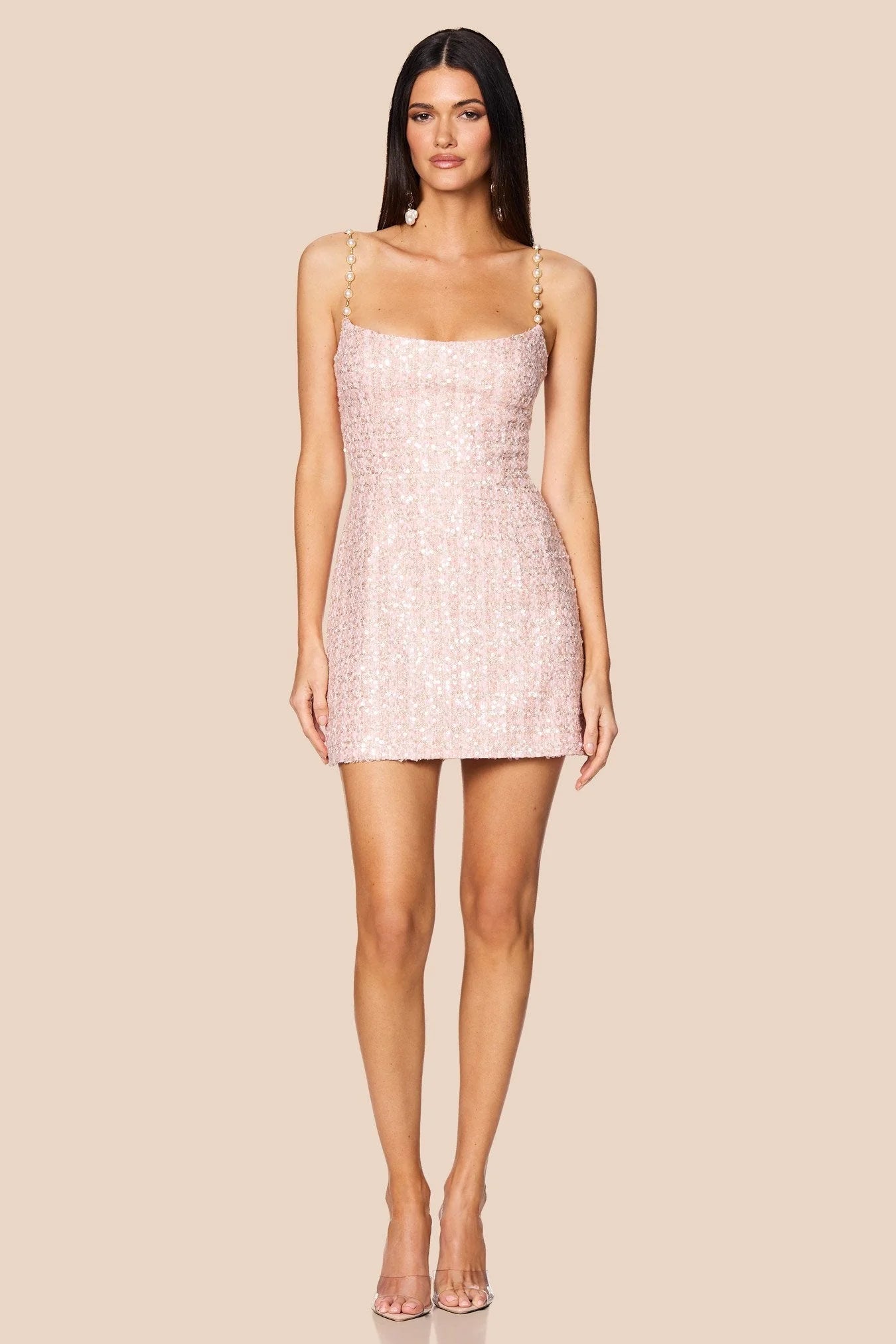 Sophisticated fitted mini dress crafted in a tweed suiting fabrication with mini sequins and pearl straps. Invisible zip at back, fully lined.