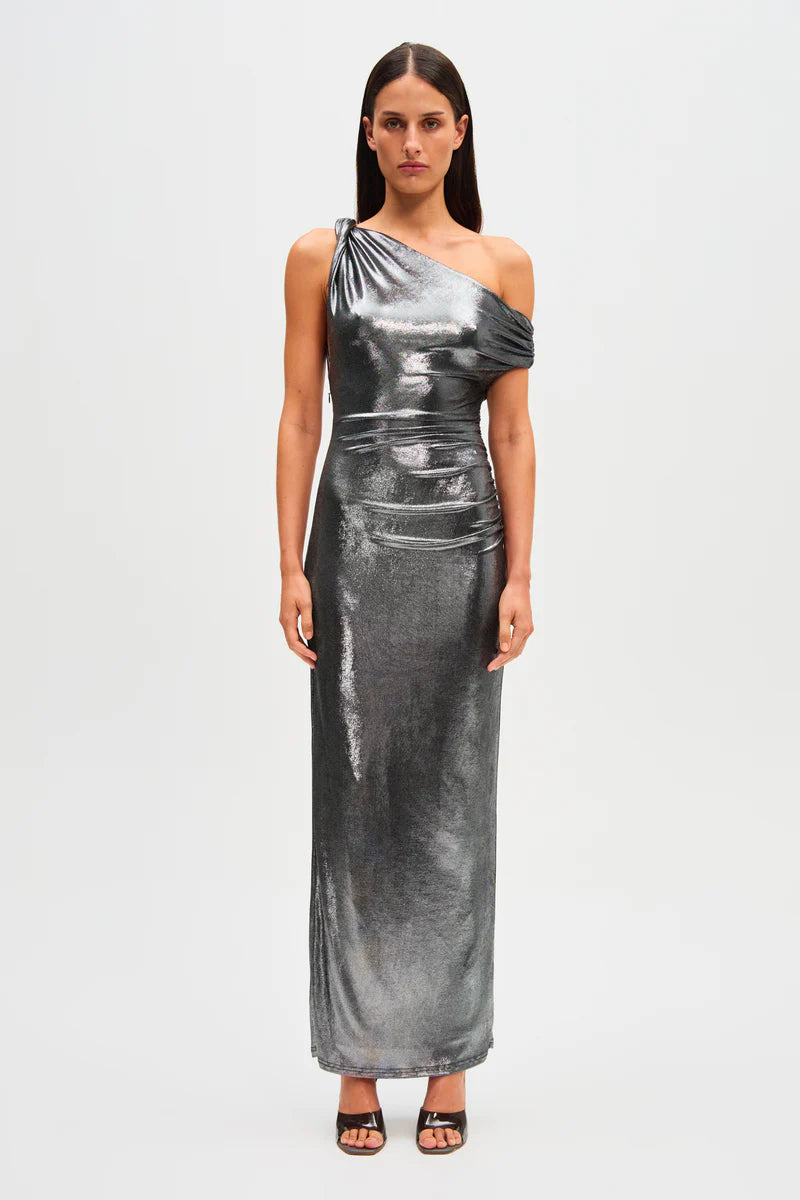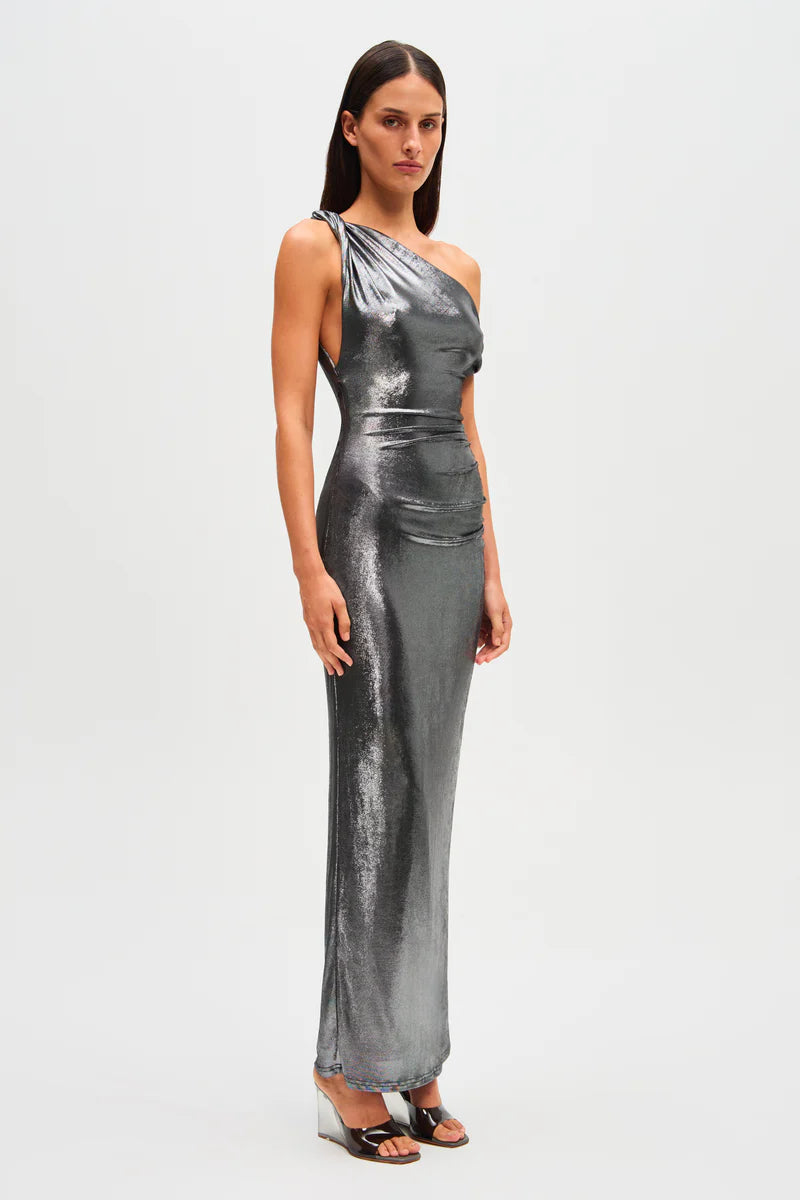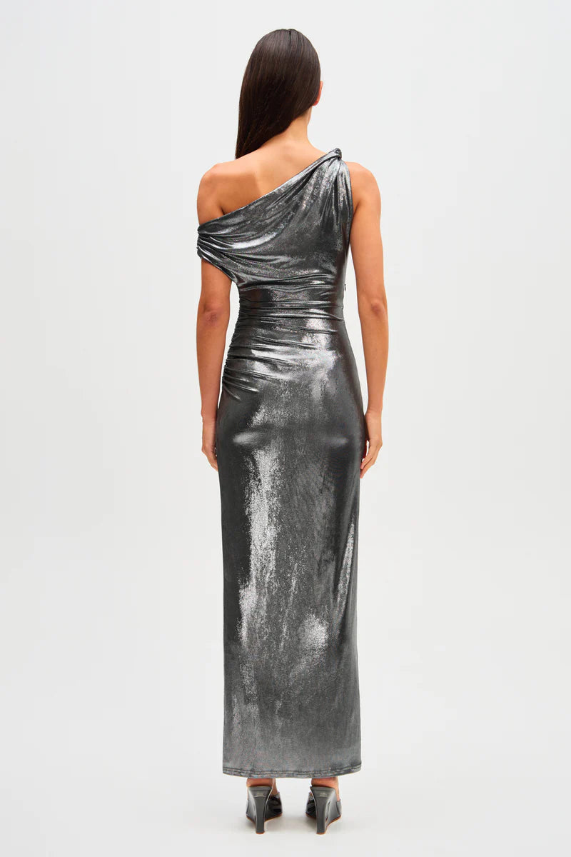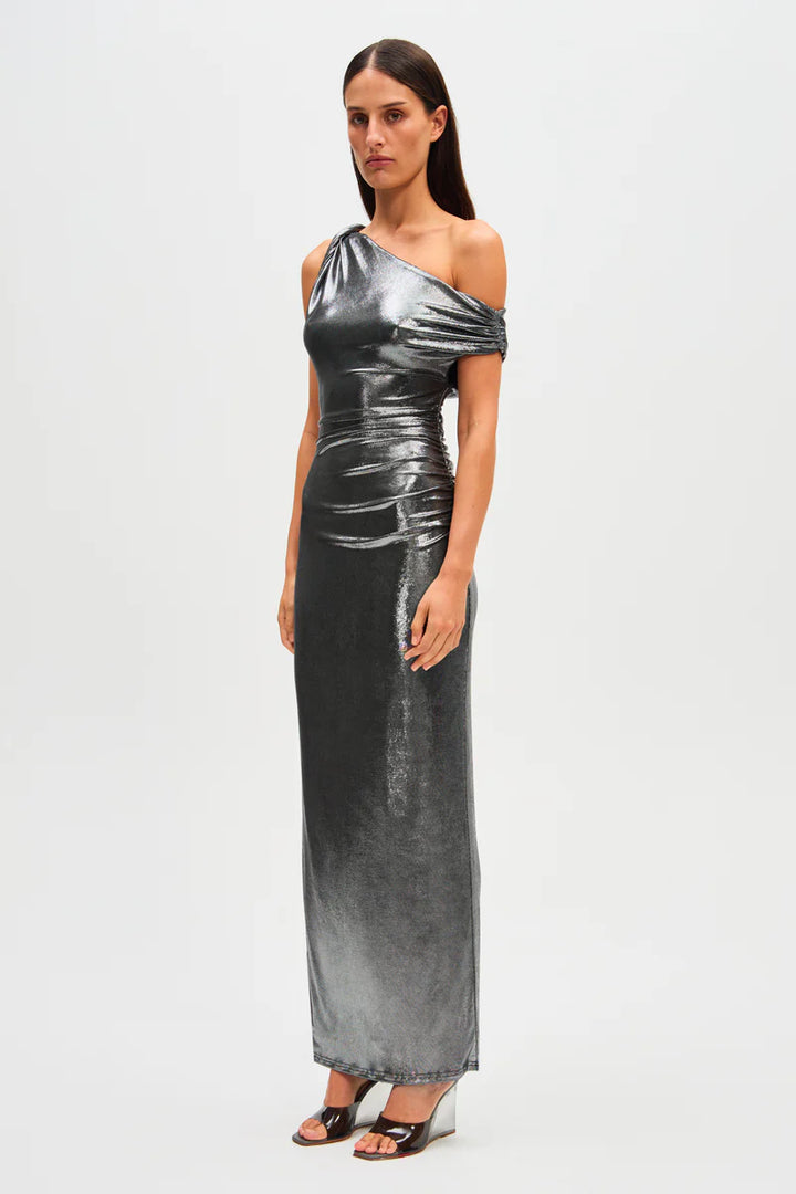 The Misha Nyra Metallic Jersey Maxi Dress in Silver, characterised by her brilliant metallic fabrication.