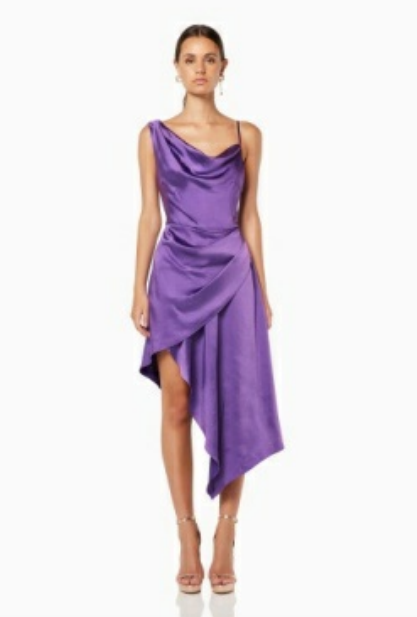 Elliatt Orla asymmetrical dress in royal purple. drappy neckline