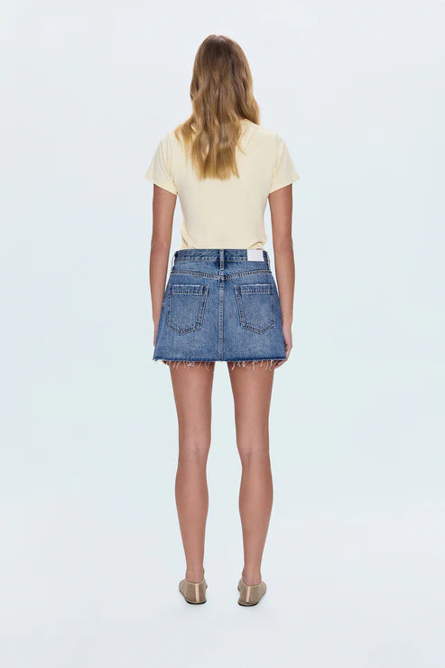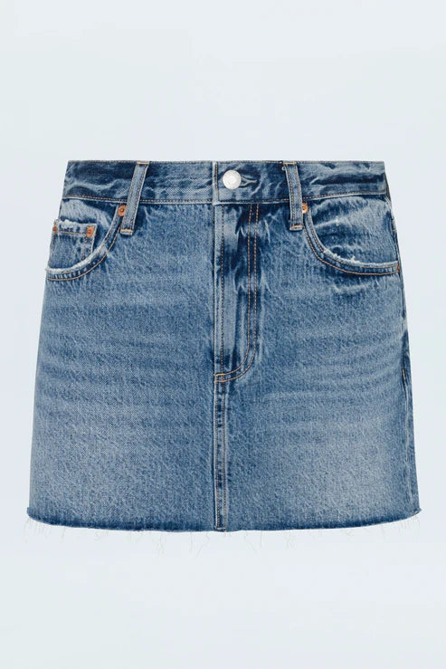 Jaunty mini skirt that sits low on the hips for breezy, cool-girl styling. Crafted from rigid non-stretch denim for an expert fit and offered in a medium blue denim wash with blasted fading.