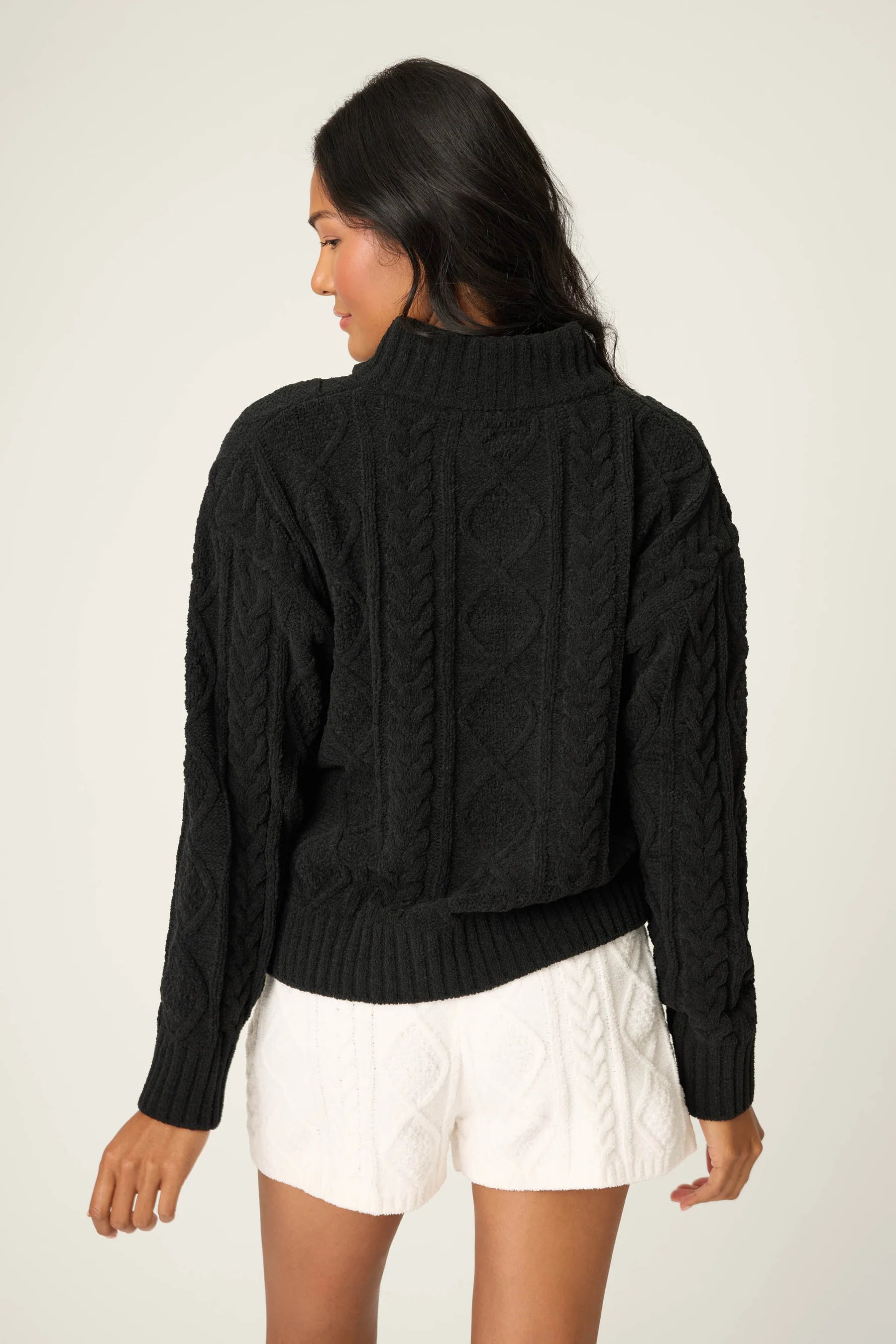 Experience ultimate comfort in the chenille cozy cable partial zip pullover. Designed with a rich knit featuring a classic cable texture, this pullover showcases a luxurious feel that adds a touch of luxury to your everyday outfit. It's perfect for layering on cool days or for lounging at home, effortlessly combining cozy comfort and style. To embrace pure bliss, pair it with the Chenille Cable Knit Lounge Pants!