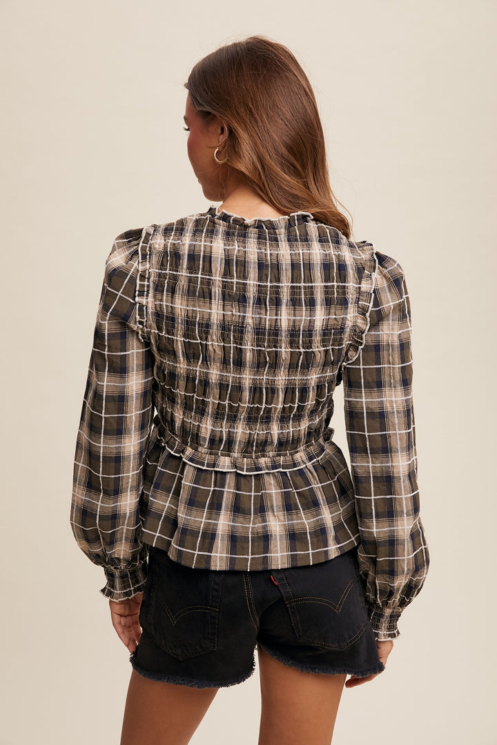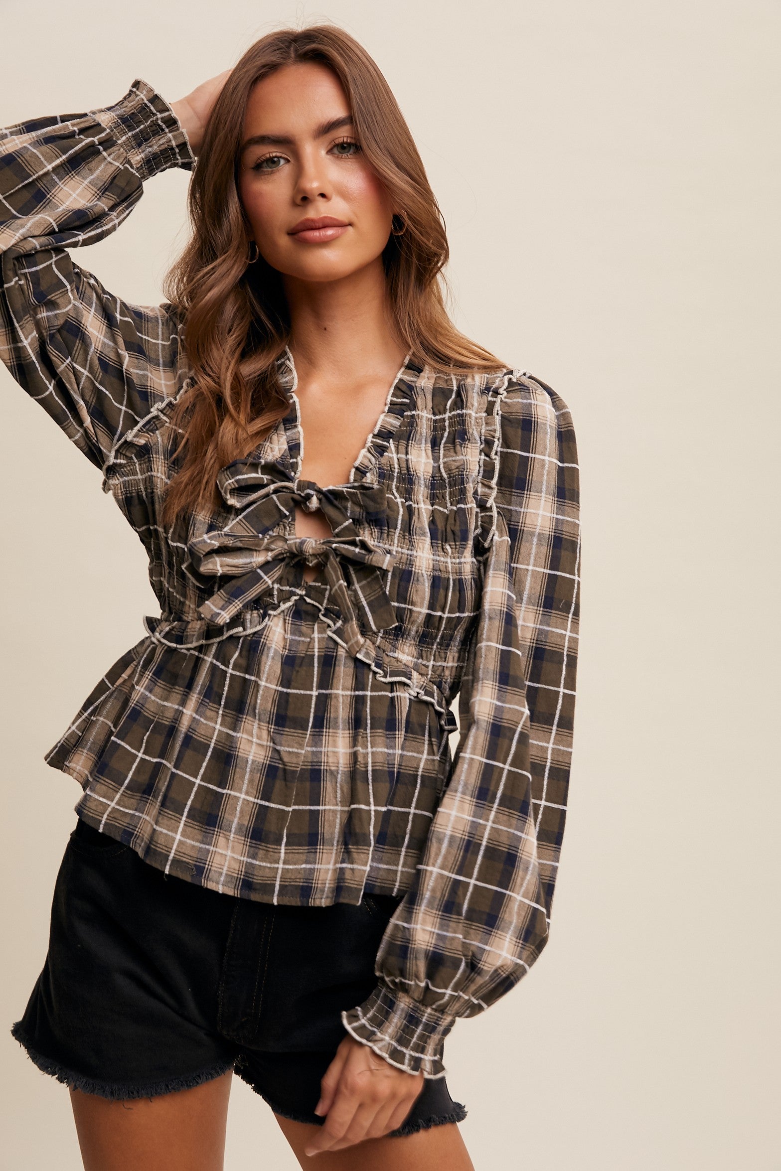 Plaid Bow Tie Long Sleeve Smocked Blouse