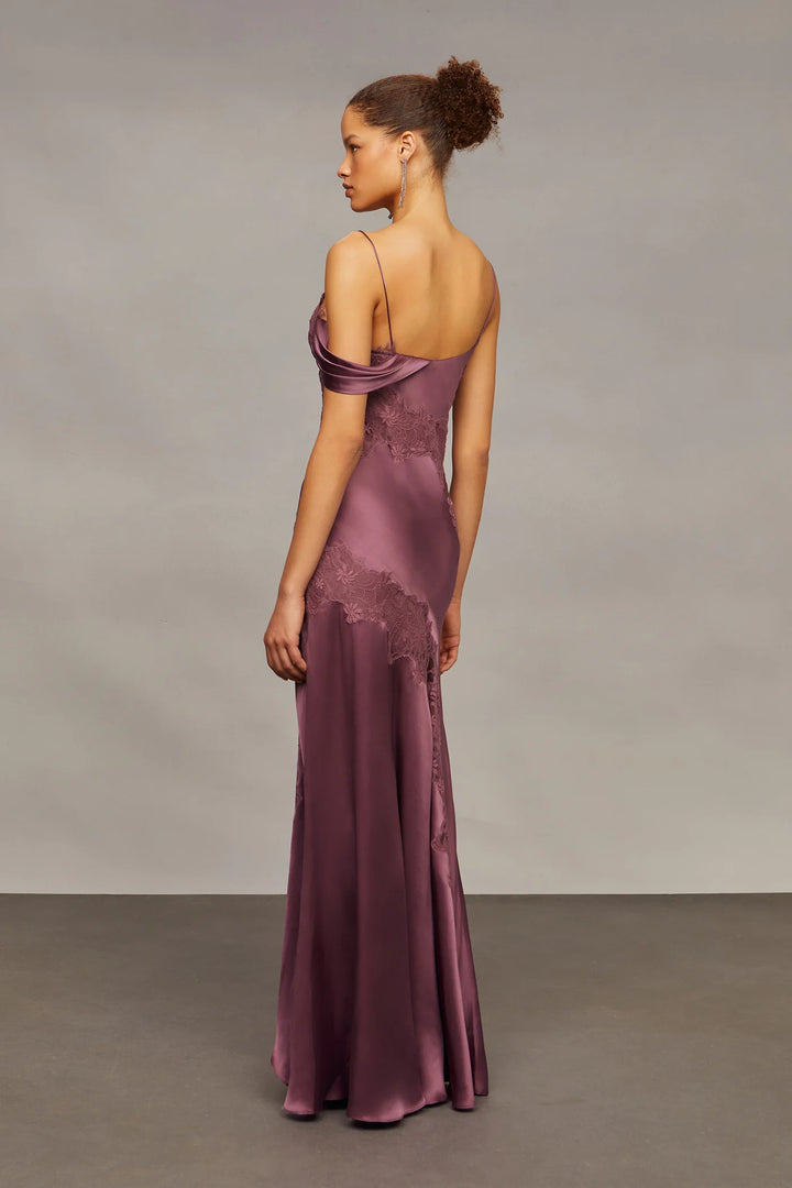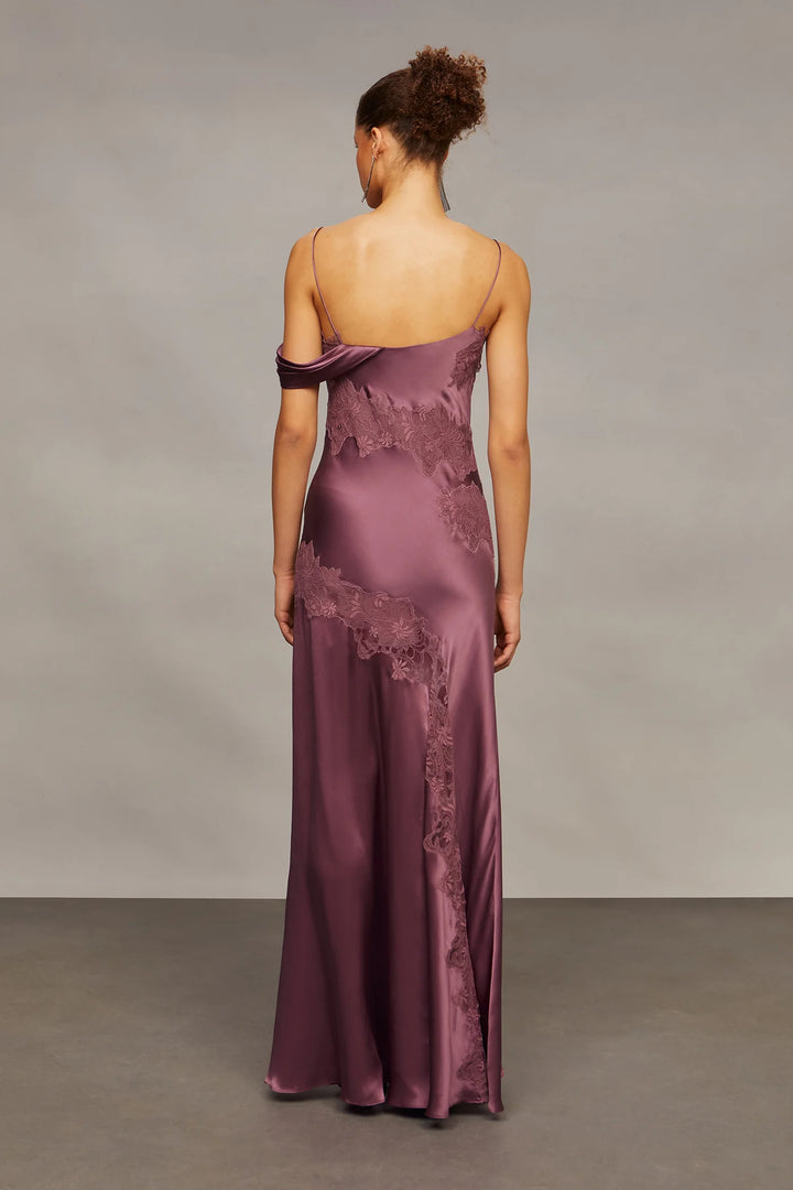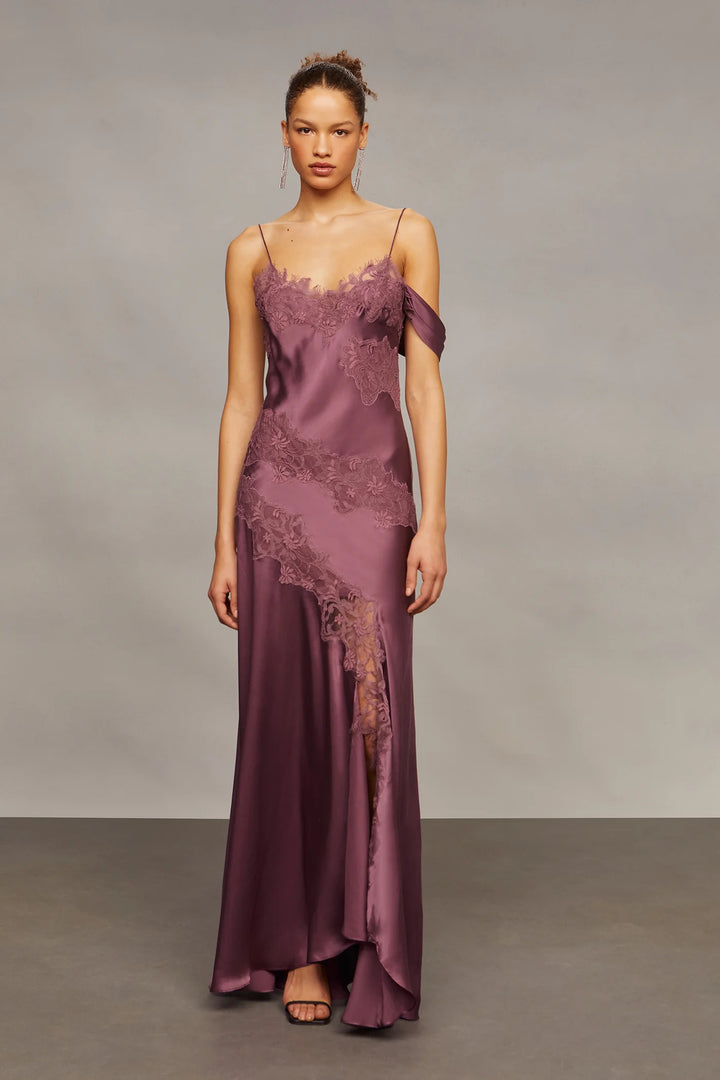 Crafted in 100% silk, this off-shoulder satin gown glides along the body with hand-placed lace appliqué in soft, cascading curves. With a sheer slit and barely-there straps, it’s your sultry take on balletcore.