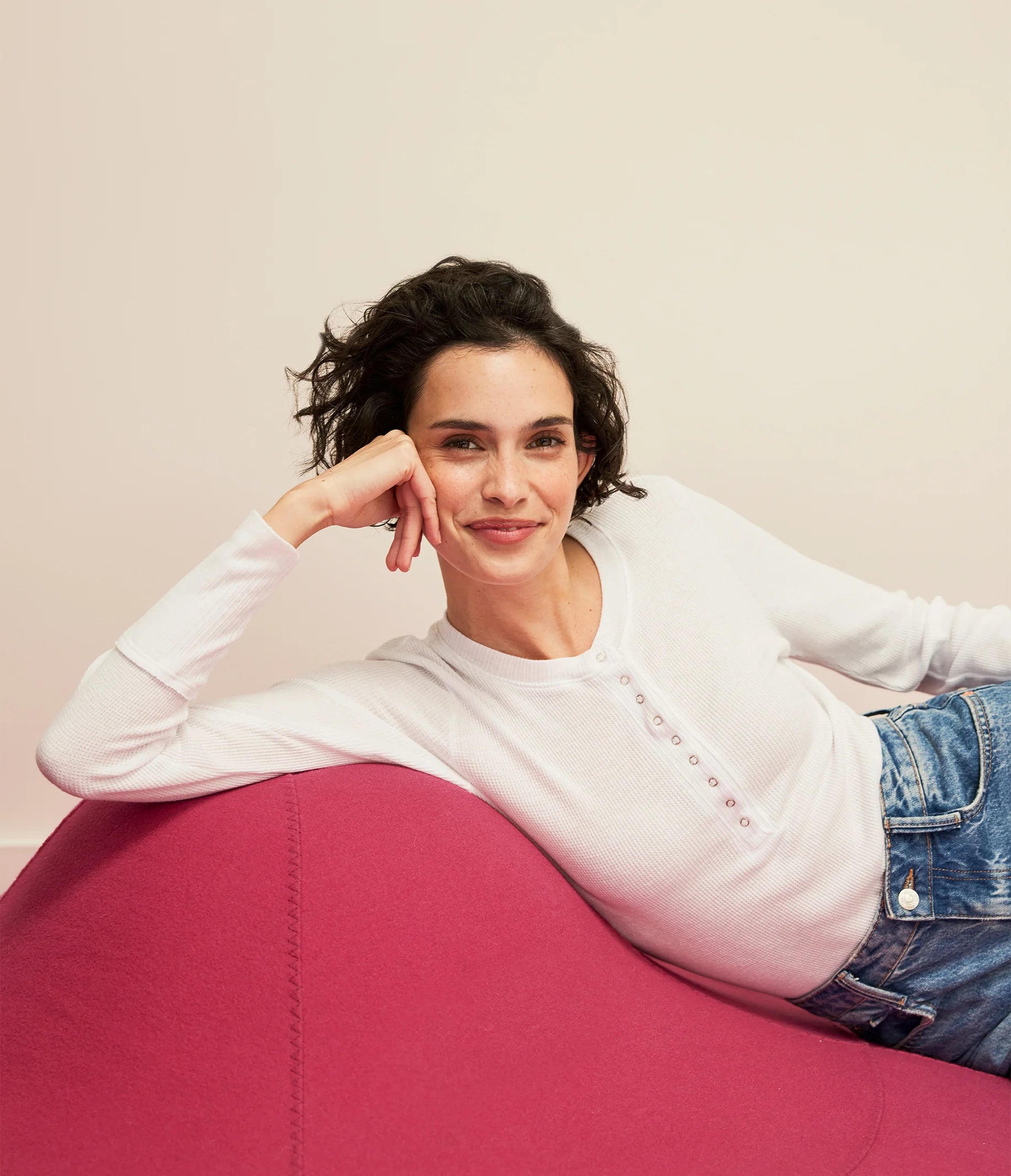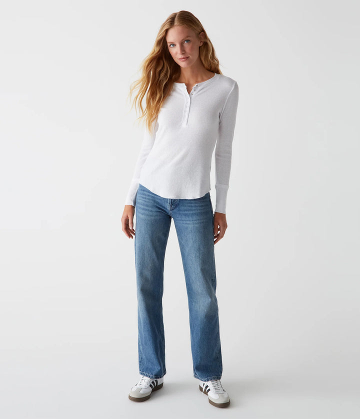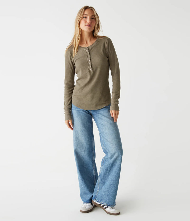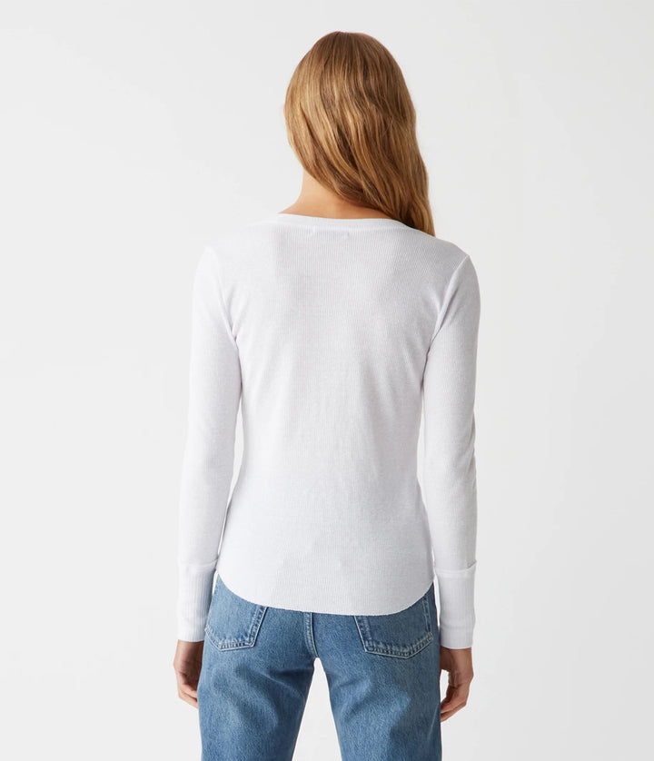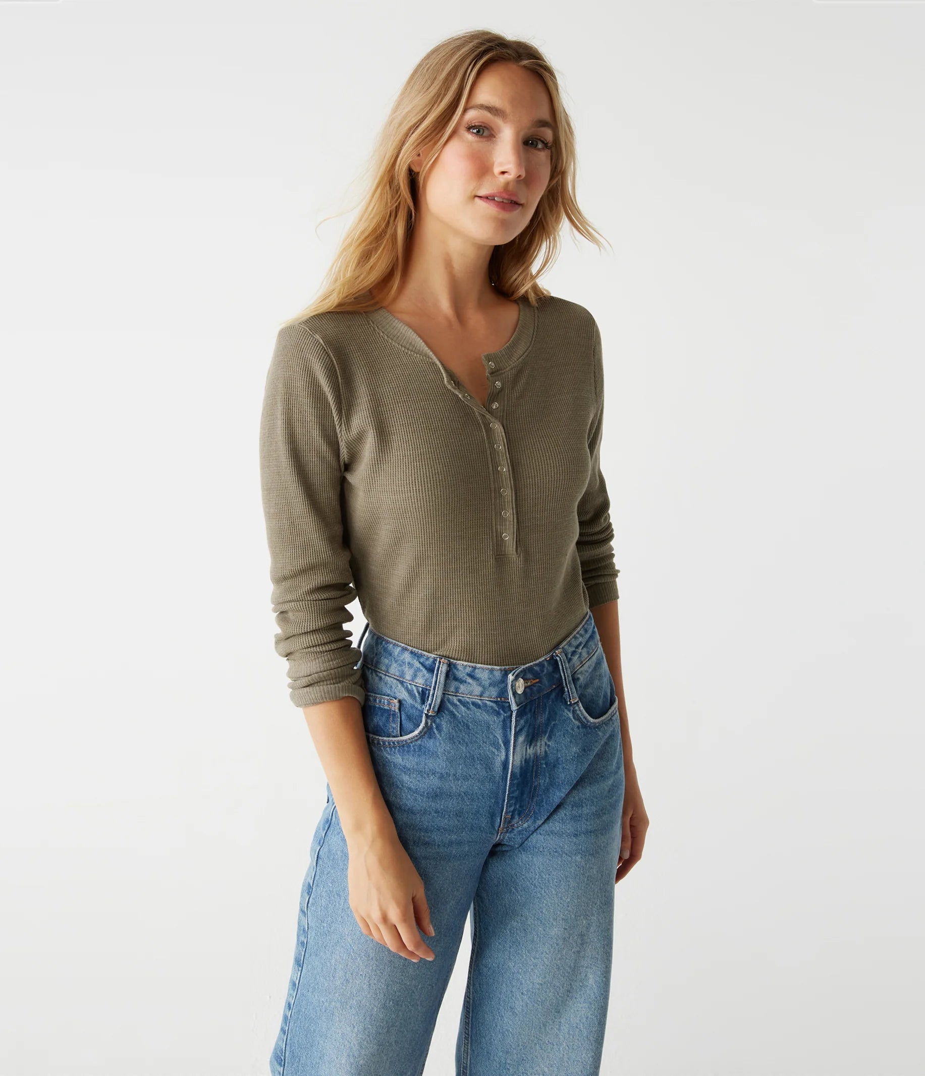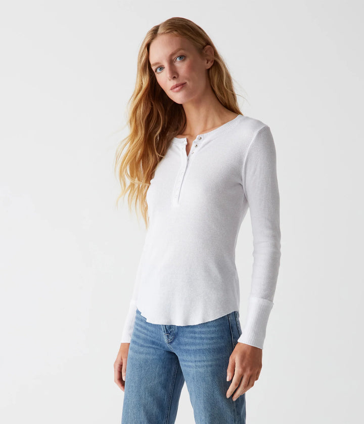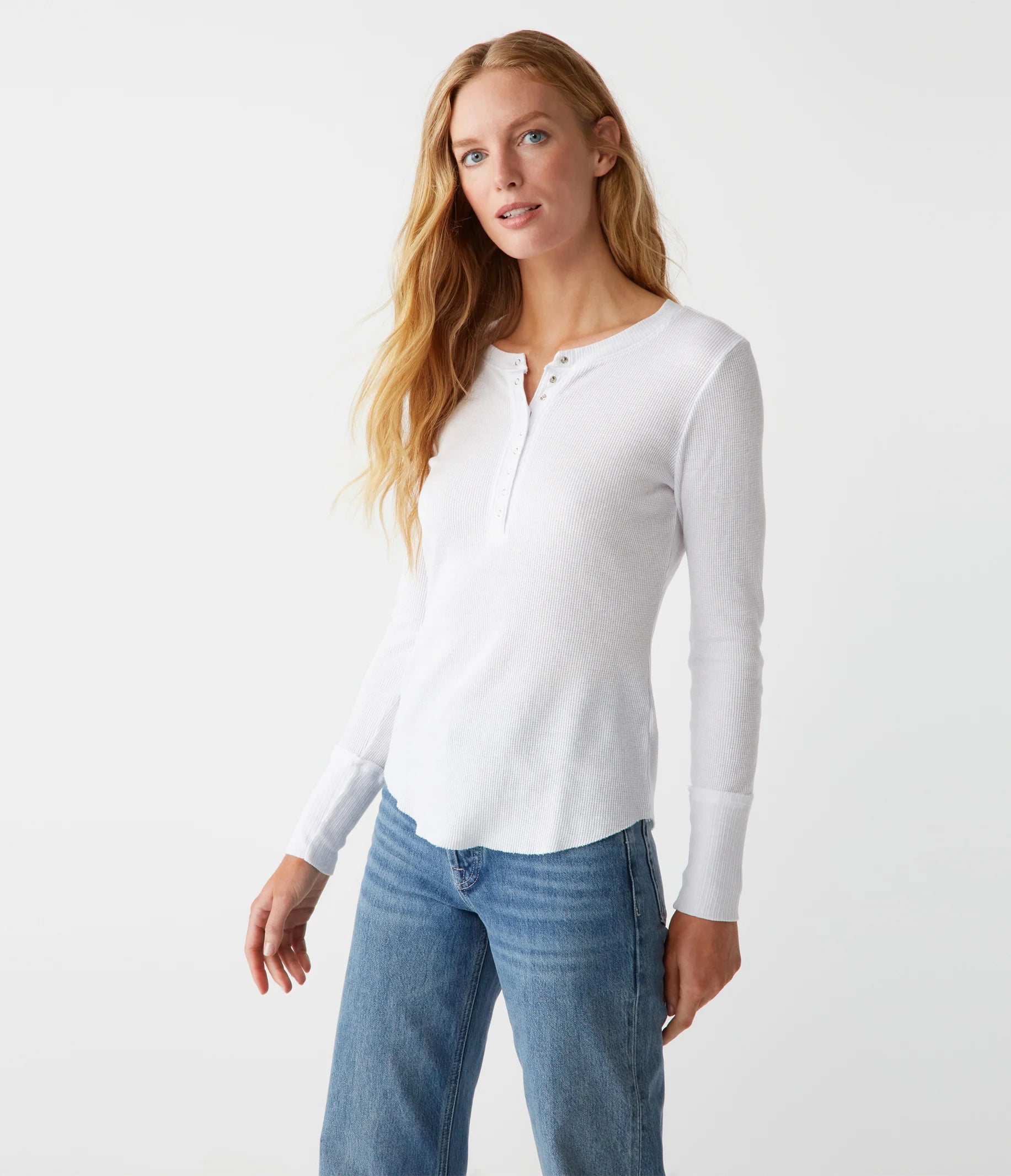 Regan is a long sleeve henley tee with a curved hem and extended cuffs. Made from Michael Stars soft Thermal fabric that is the perfect mid-weight, waffled texture, and is great alone or for layering.
