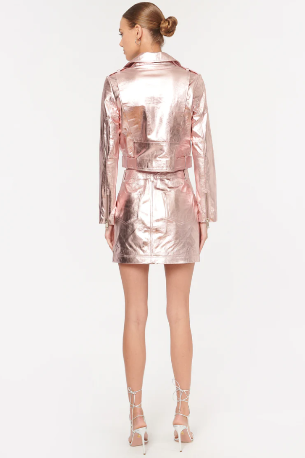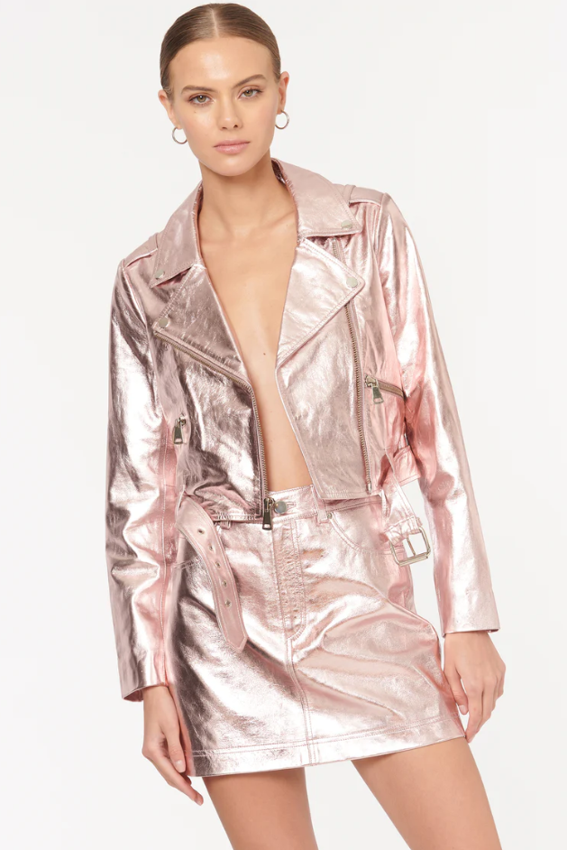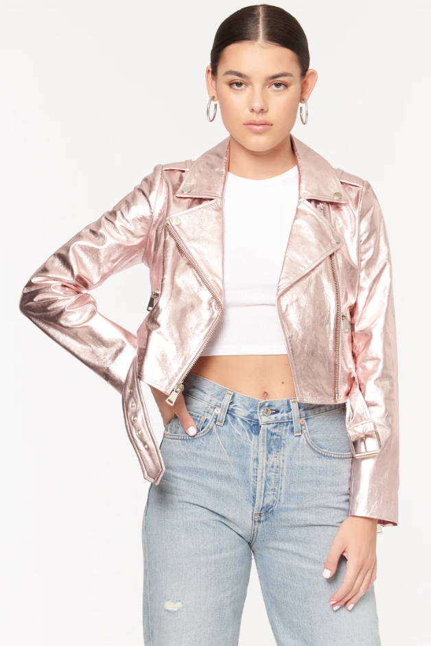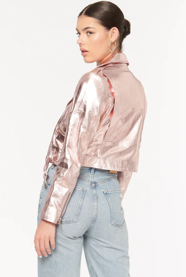 The new Kali Genuine Leather Jacket by Cami NYC is the perfect layering piece over camisoles, blouses, and dresses. Crafted in a supple and luxurious leather, this crop-length motorcycle jacket is a sleek silhouette with silver hardware. The Kali is designed with a zipper front closure with a notch collar and features front angled zipper pocket details.