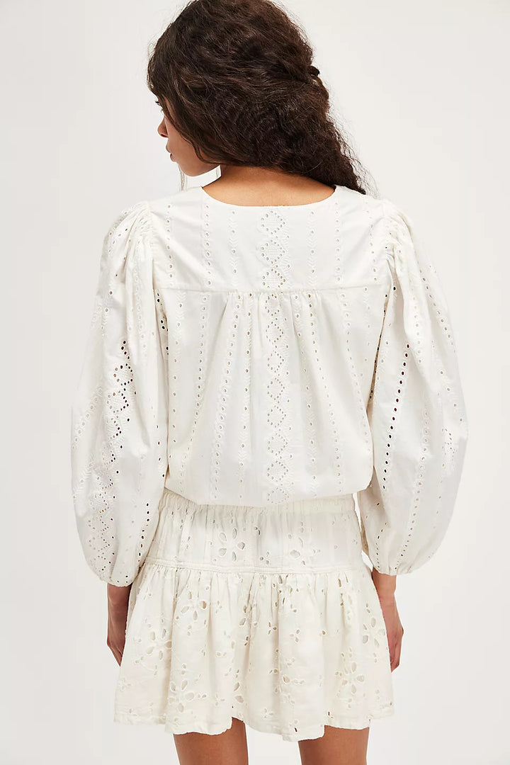 Features: Front button-up detailing, dropped yoke seam, eyelet lace fabrication